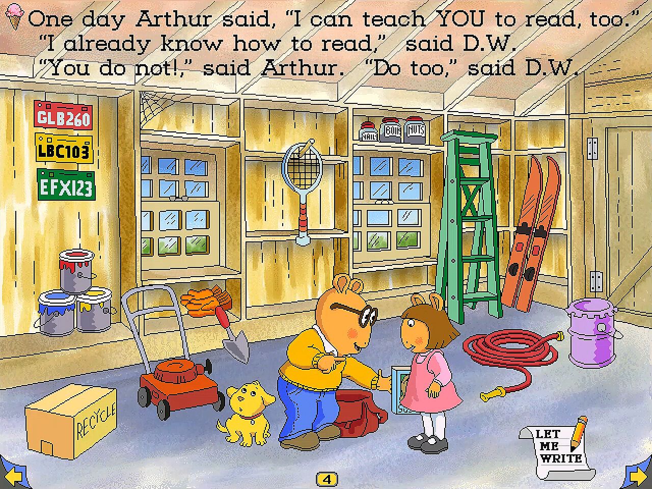 Arthur’s Reading Race centers around everyone’s favorite Aardvark. Arthur is trying to teach his little sister, D.W, to read. However, she insists that she already knows how! After a heated conversation, Arthur challenges D.W to read ten different words with a promised reward of ice cream! Will D.W be able to read all ten words for the ultimate reward?
