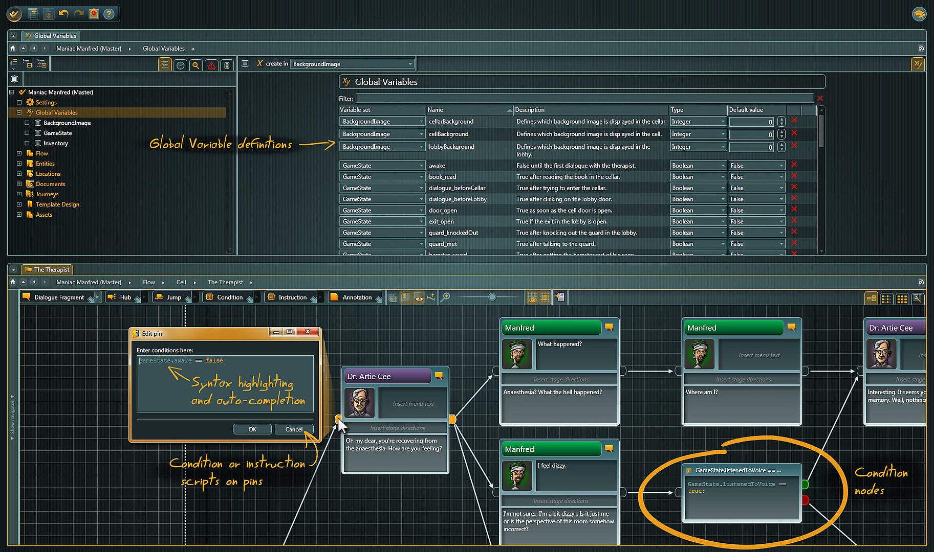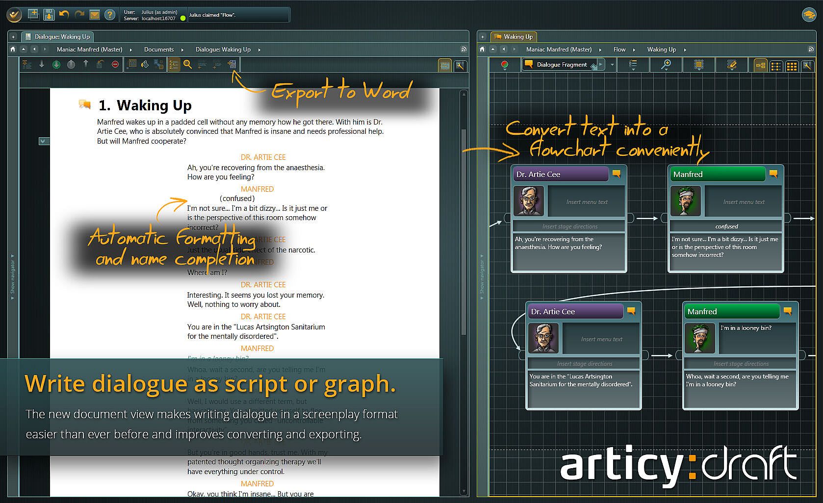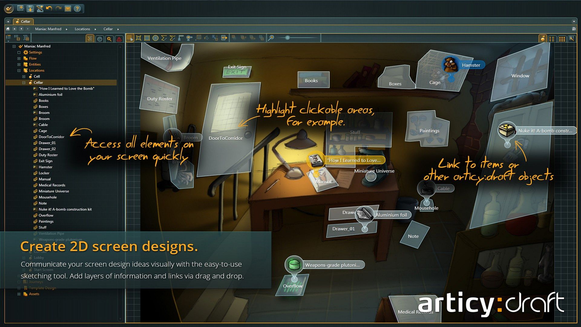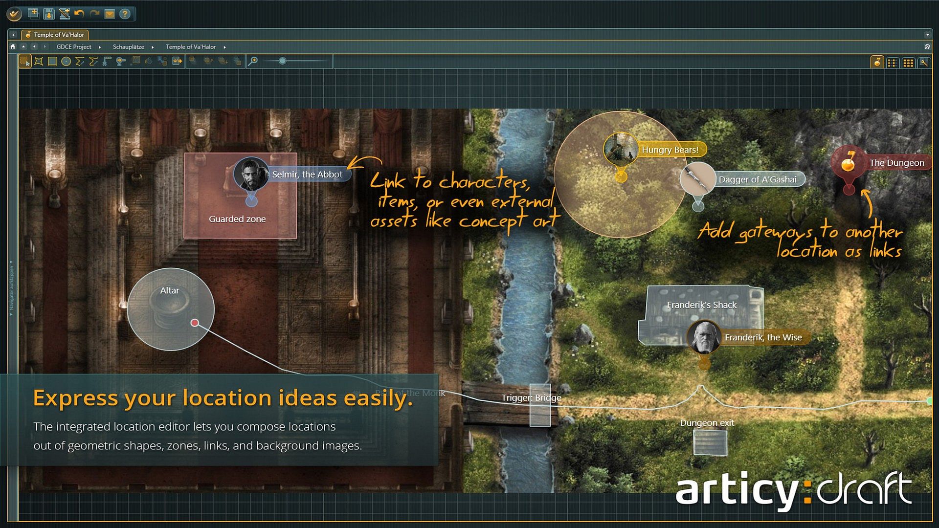 articy:draft is a visual environment for the creation and organization of game content. It unites specialized editors for many areas of content design in one coherent tool. All content can be exported into various formats, including XML and Microsoft Office.