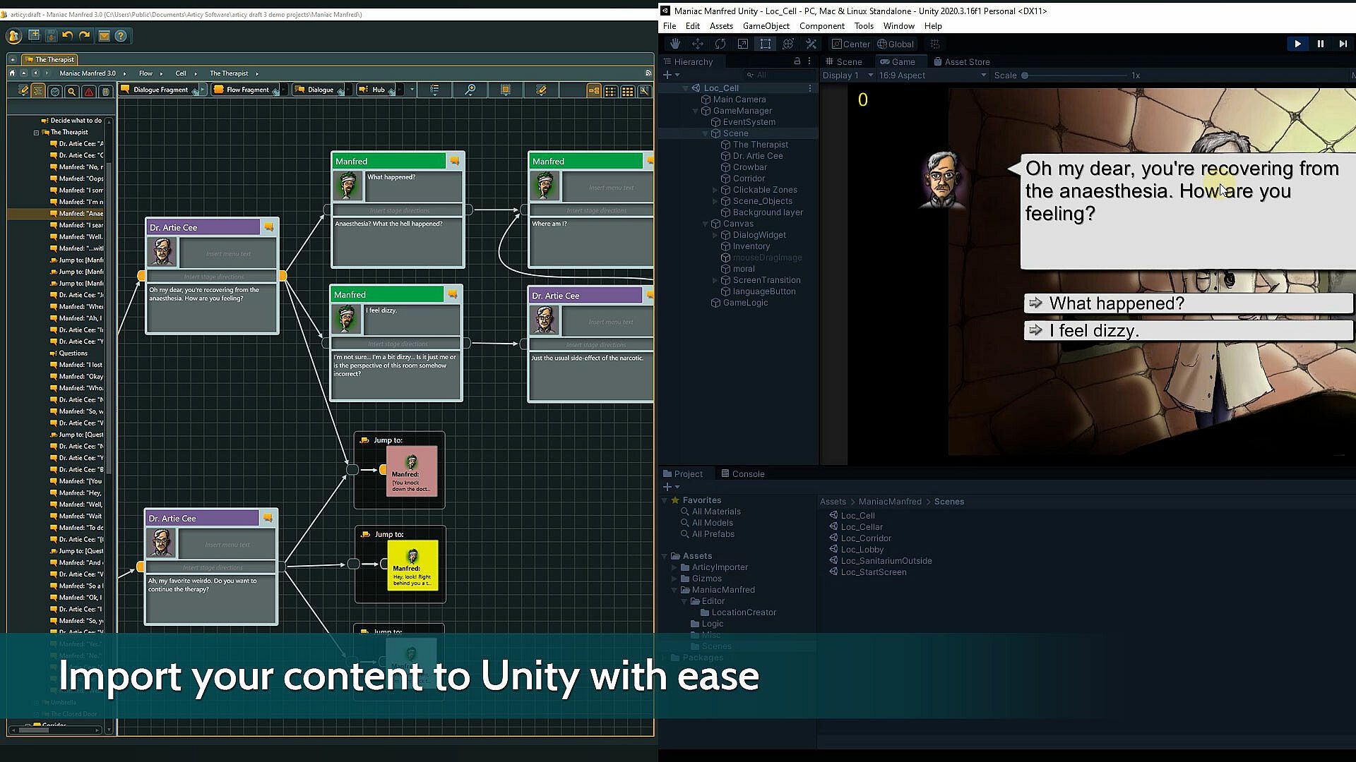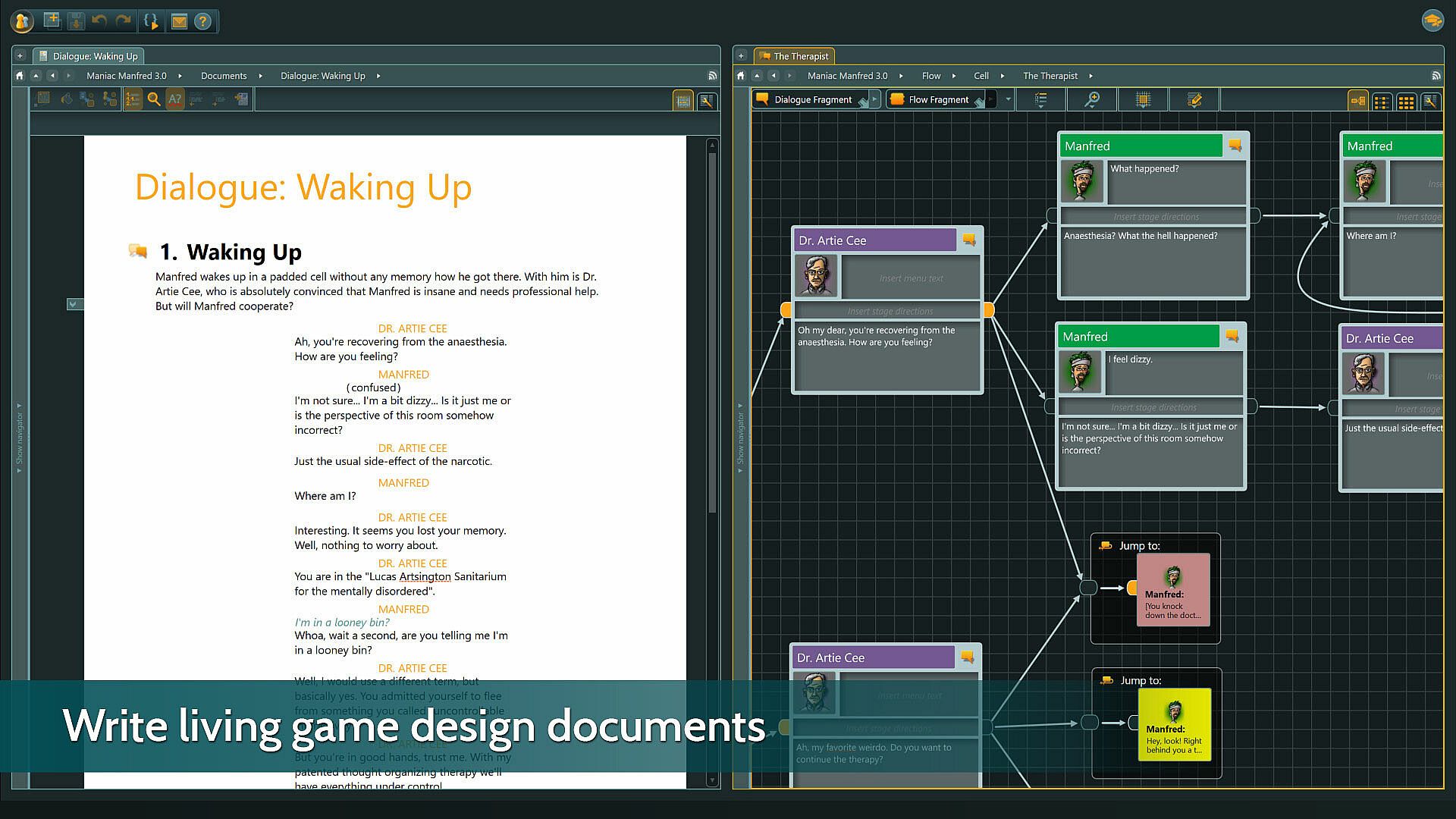 Articy:draft is a visual tool for creating interactive stories and managing narrative content: witty dialogue, compelling choices, charming characters, useful items, challenging quests, strategic locations, global variables and more. All content can be exported into various formats - including JSON, XML and Microsoft Office. You can also integrate your content easily into Unity or Unreal with the comprehensive articy:draft Importers.