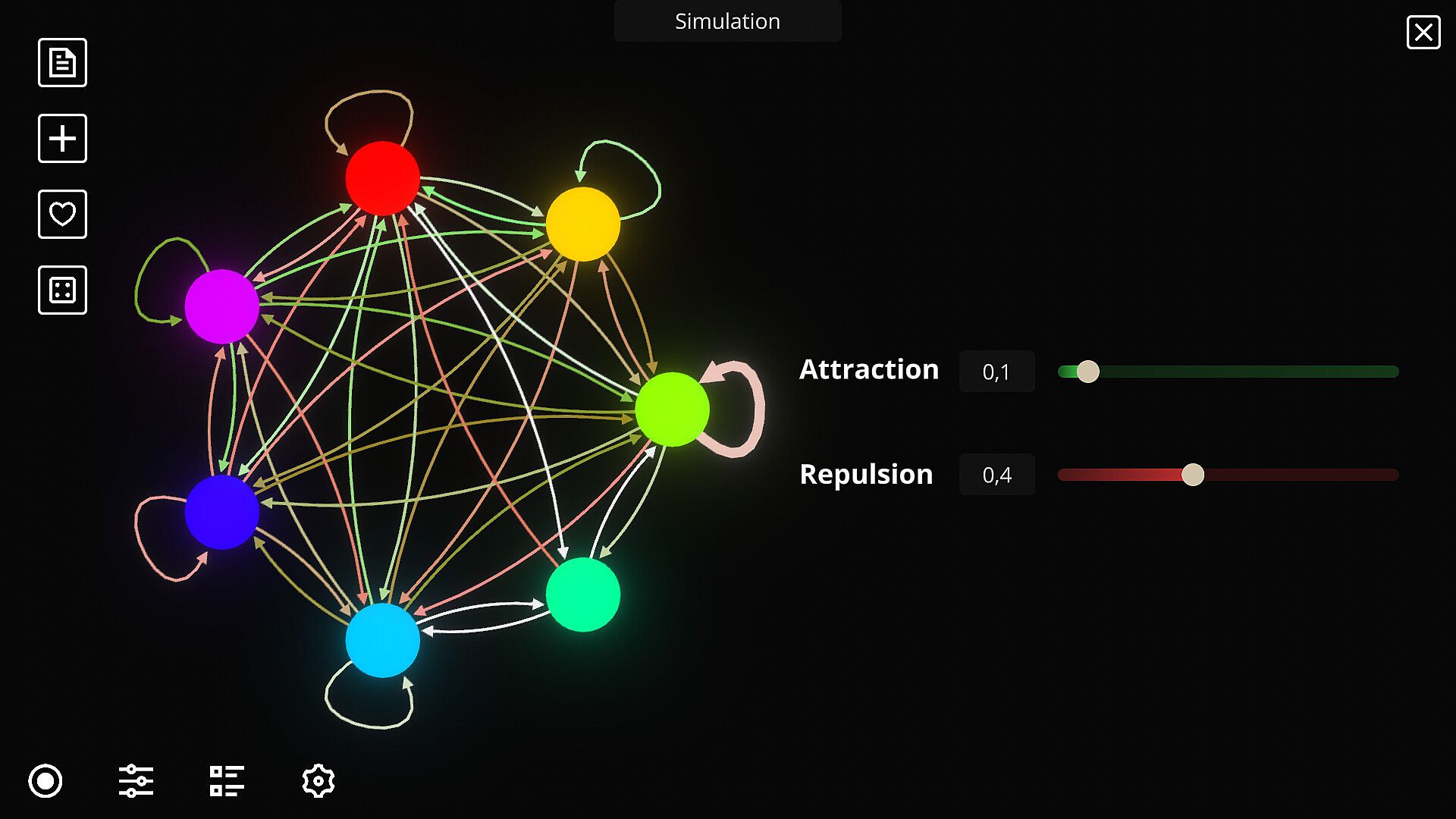 Artificial Life Simulator is a relaxing and colorful simulation game where you create artificial life forms based on particle interactions. The particles interact with each other through forces, resulting in unique emergent behaviors.