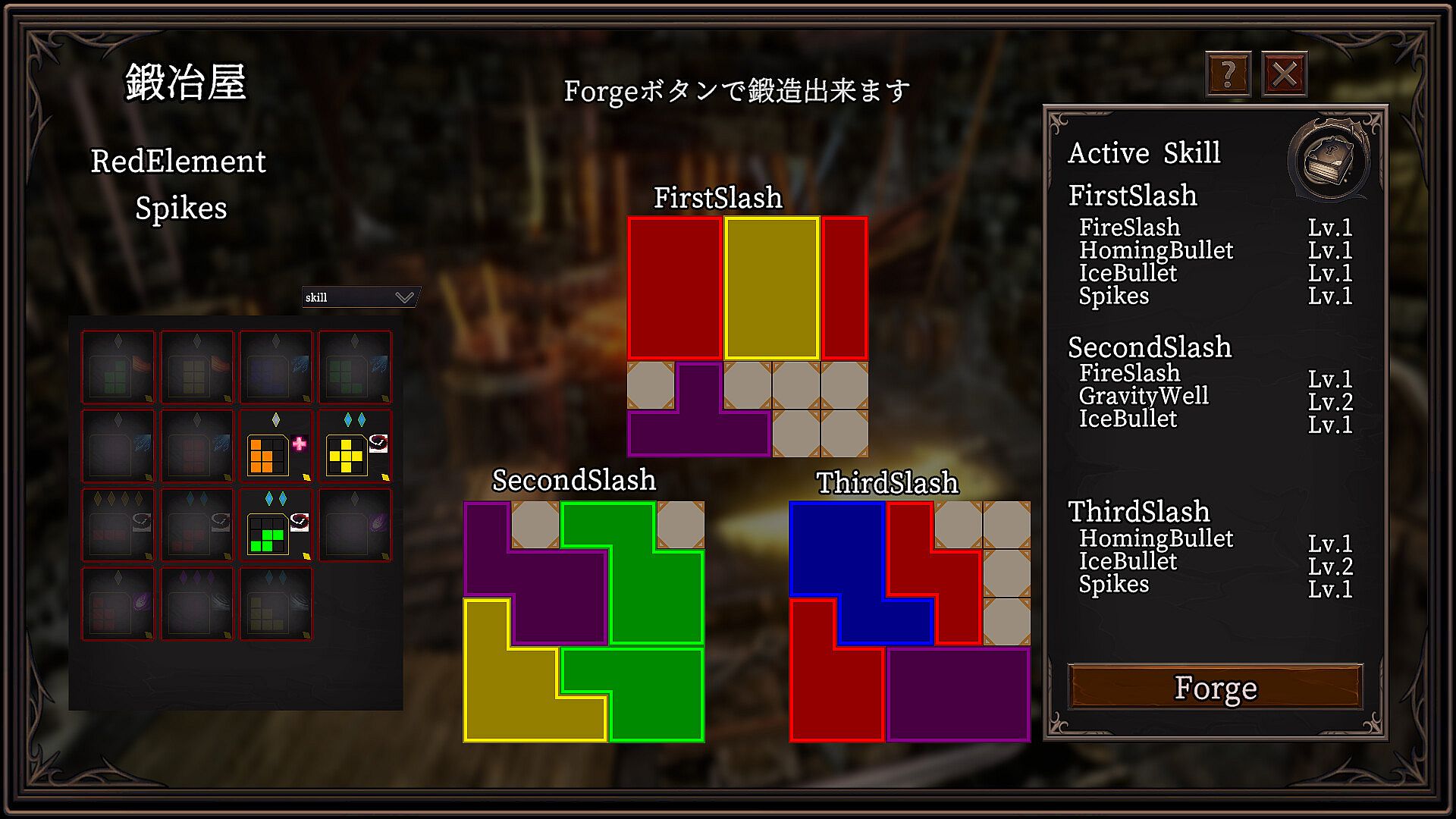 Items come with attributes such as color, skills, and grid sizes up to 3×3. Place them into a central 5×5 crafting grid to forge your weapon. The grid is divided into three sections—First, Second, and Third—each corresponding to a stage of your attack combo. By combining different skills across these stages, you can create weapons tailored to your playstyle.