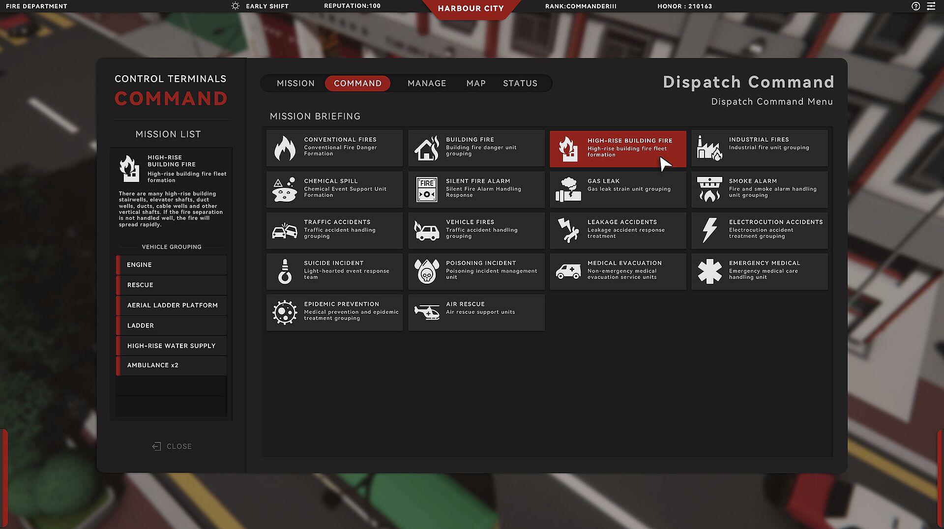 As the Commander of the Fire Department, you are responsible for managing all kinds of emergencies, from small things like removing a wasps’ nest to significant matters such as a gas leak. While at the Fire Department, not only may you encounter fire accidents, but you may also come across natural disasters or emergent public events. However, there is no need to worry; firefighters with various duties and varied vehicles, as well as tools, are all at your service. You can keep the damage to a minimum as long as you reasonably coordinate the resources.