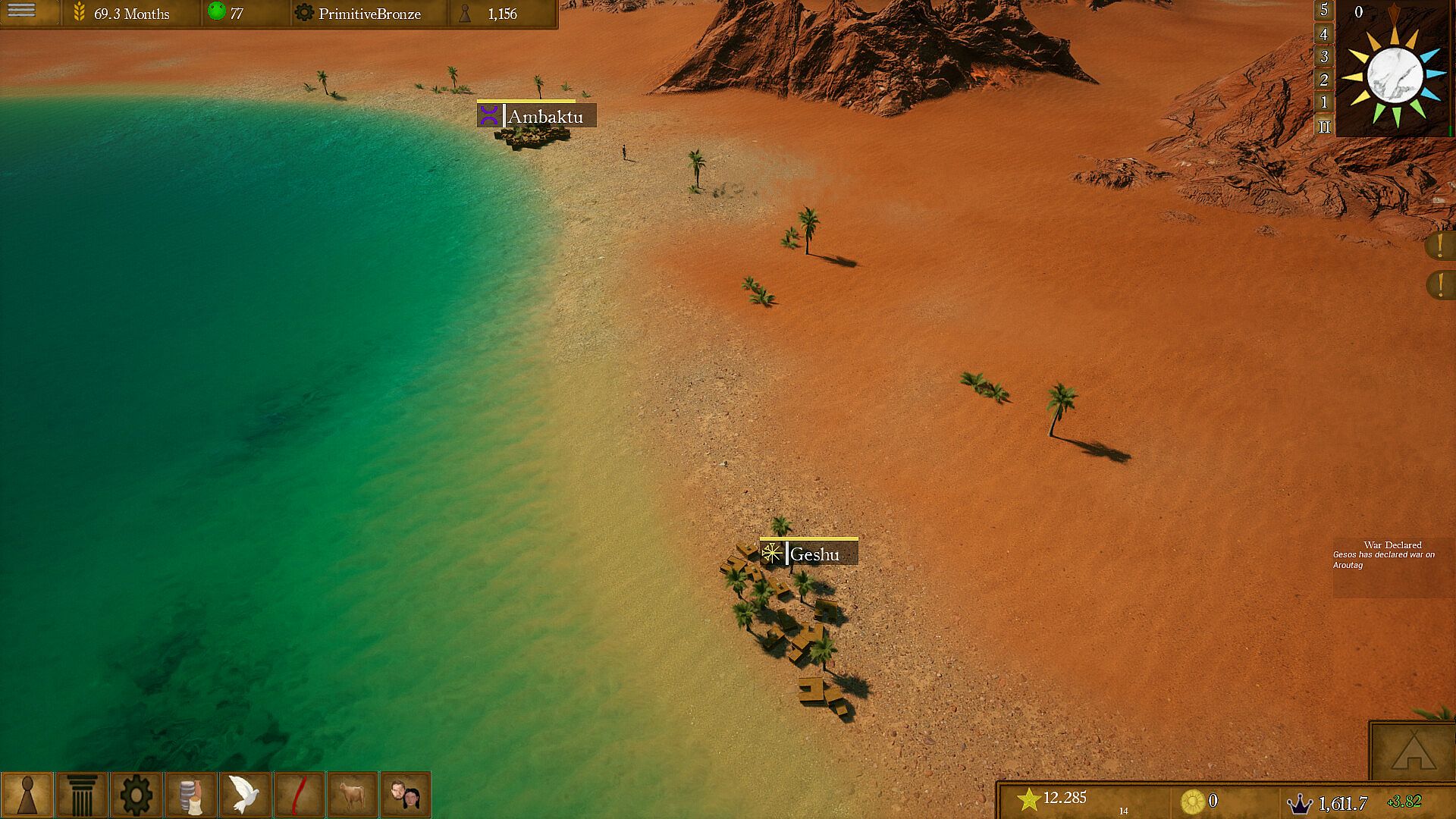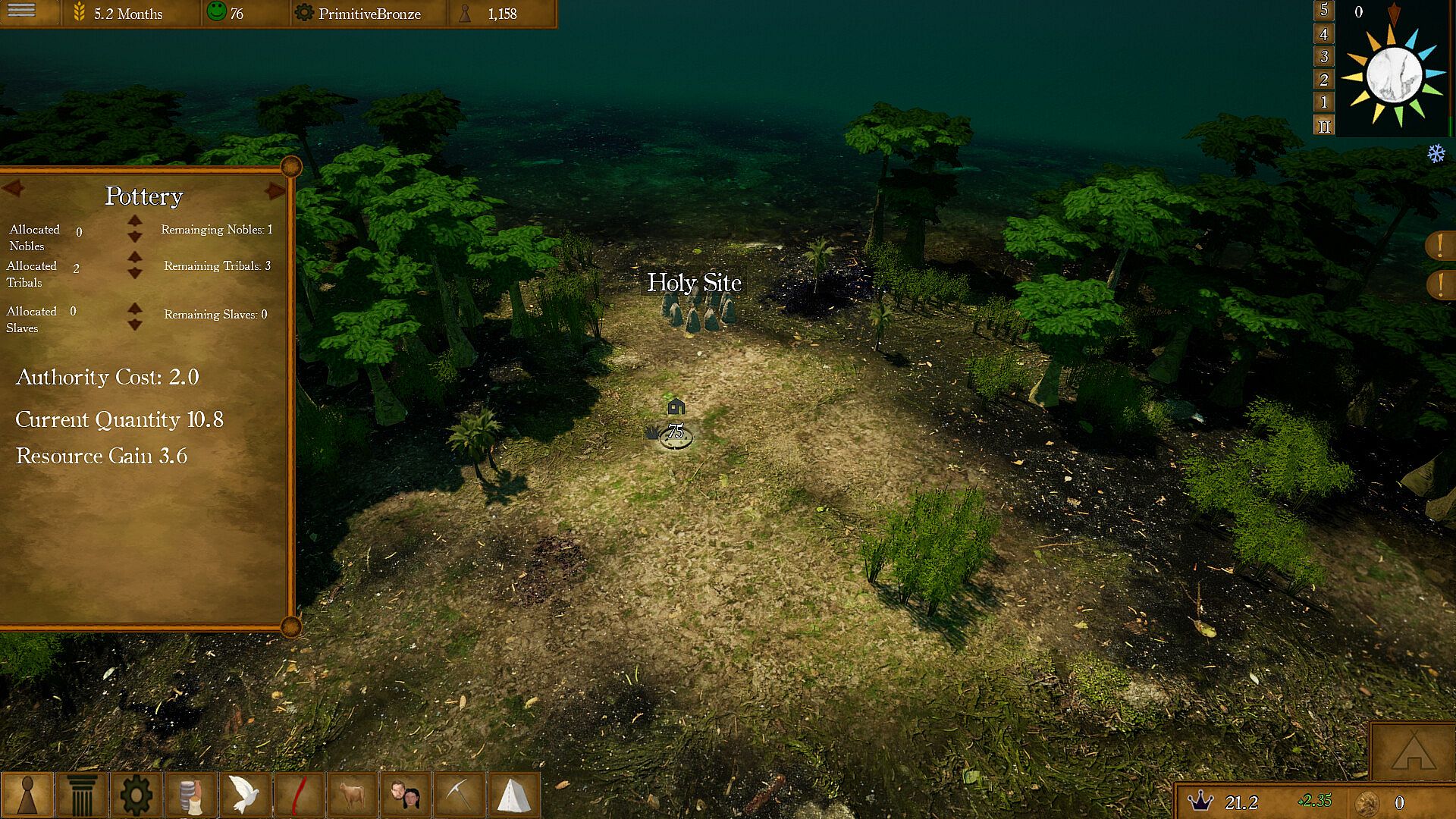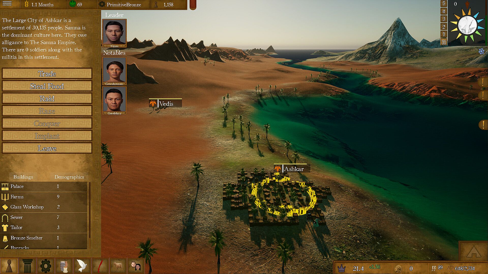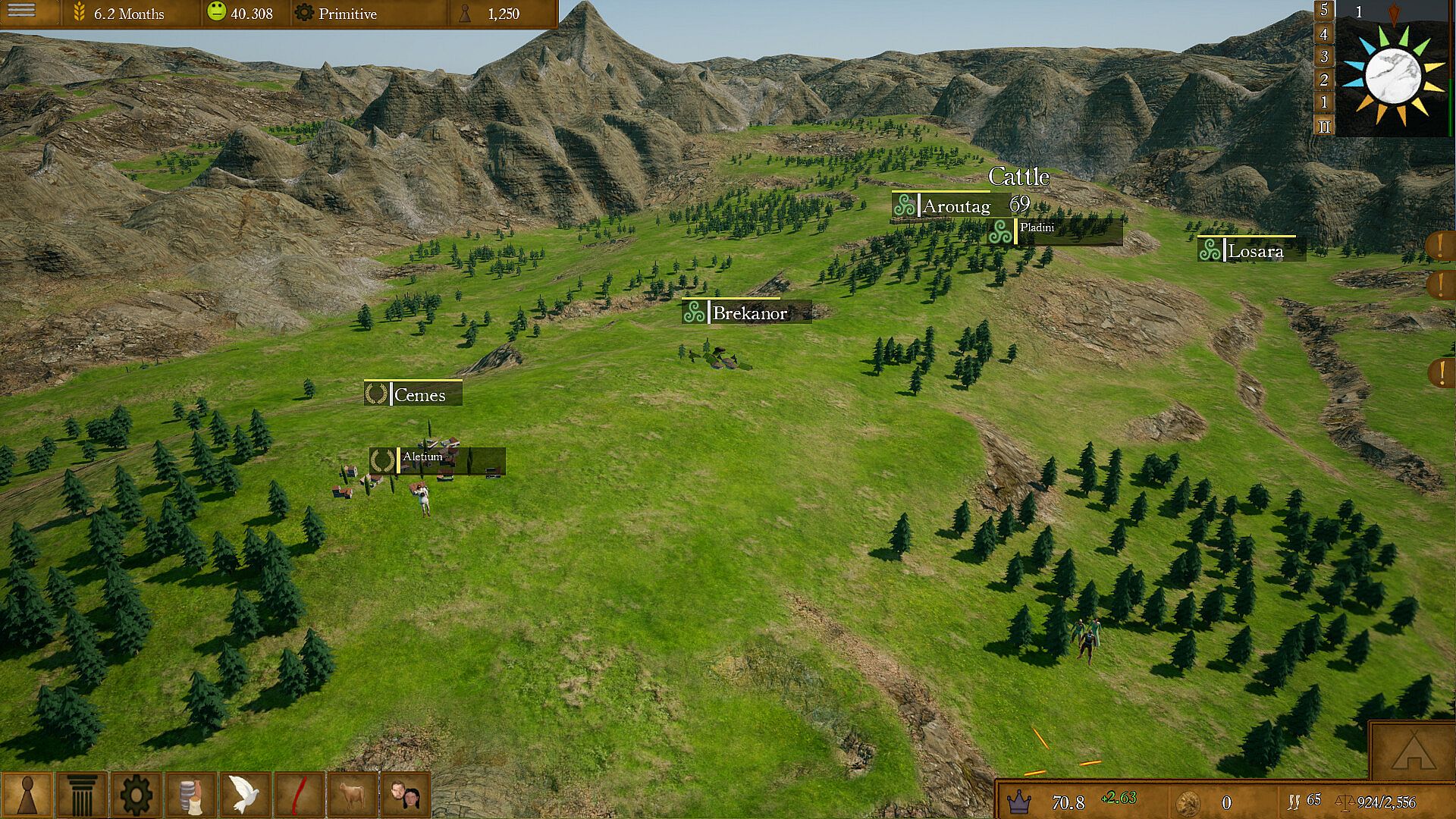 Your population is your most valuable resource. The population system forces you to think long term problems like demographic collapse are an ever present threat and if you force your farmers to be soldiers then no food will be produced. As well as human population you also control herds of livestock which can be domesticated providing more benefits