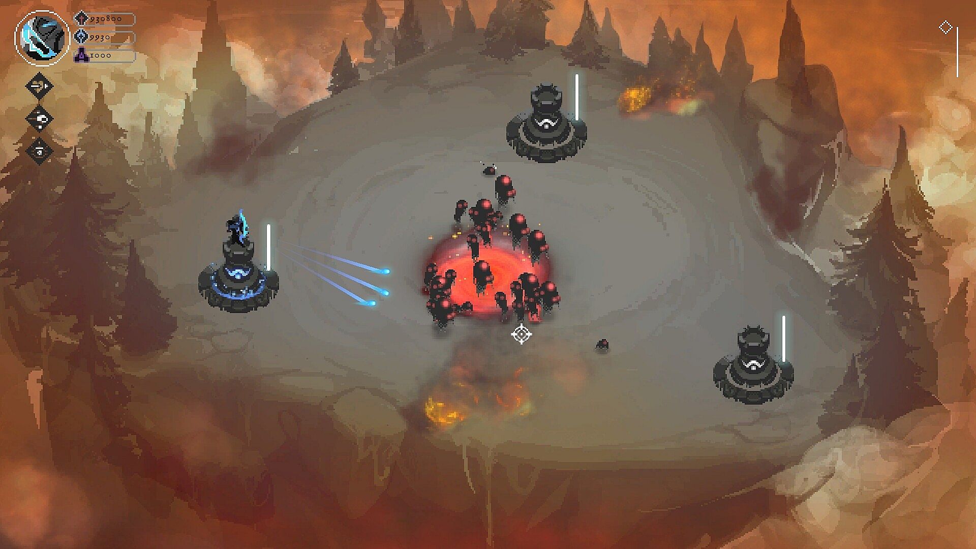 Defend against the Redgaze hordes and collect their remains. Keep an eye on all of your towers! If one of them falls, it's over.