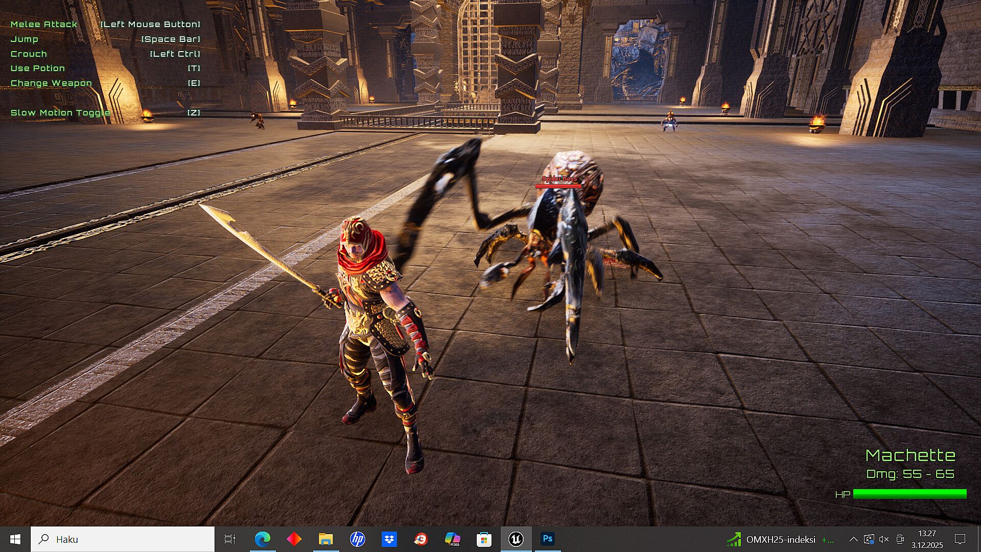 Giant spider and his army has captured valuable skulls and hidden them. Player warrior mission is to beat spider boss and his difficult army in this medieval rpg game. Player fight against different small creatures which have different attacks like punch attack, magic attack, bomb attack etc and also small spider are in different themed medieval levels. End of level player meet big spider who has different attacks. Player need kill boss and then fence or gate will disappear and player can collect skull and finish level. Game contain now 7 different levels. Player can use health potions and select several different swords and axe to use.