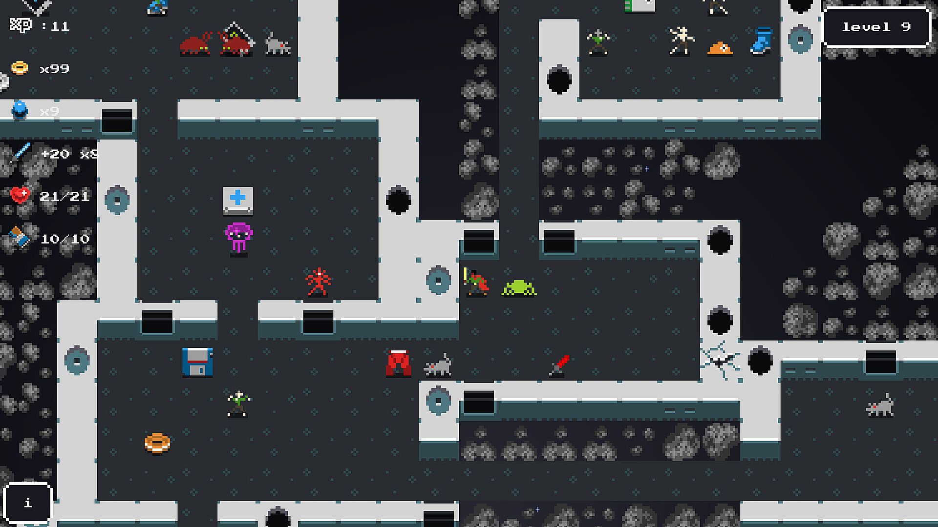 Asterogue is a fast, minimal roguelike directly inspired by the original Rogue. Descend through 17 unique levels into the heart of an asteroid to find the Cursed Orb and save the galaxy. Balance futuristic hand weapons, armour, chemicals, nanotech, medkits and food as you battle increasingly dangerous aliens from outer space.