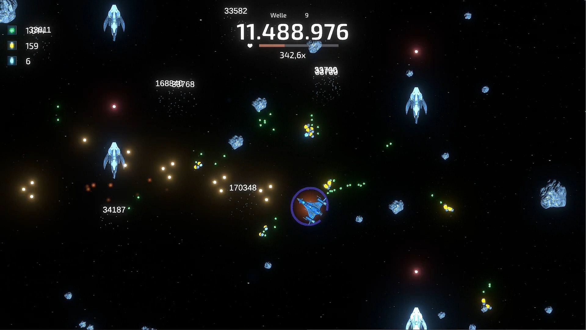 Similar to a classic asteroids game you pilot a spaceship through an asteroid belt, but additionally fight waves of enemies. Every hit gives you some score and increases your score multiplier. Go for the highscore! Progress by unlocking more ships and applying upgrades and dive into higher difficulties!