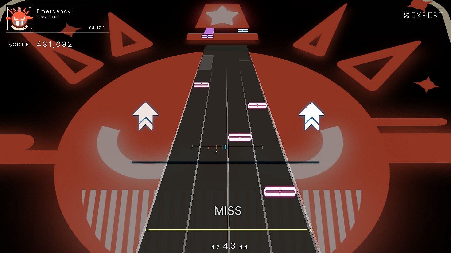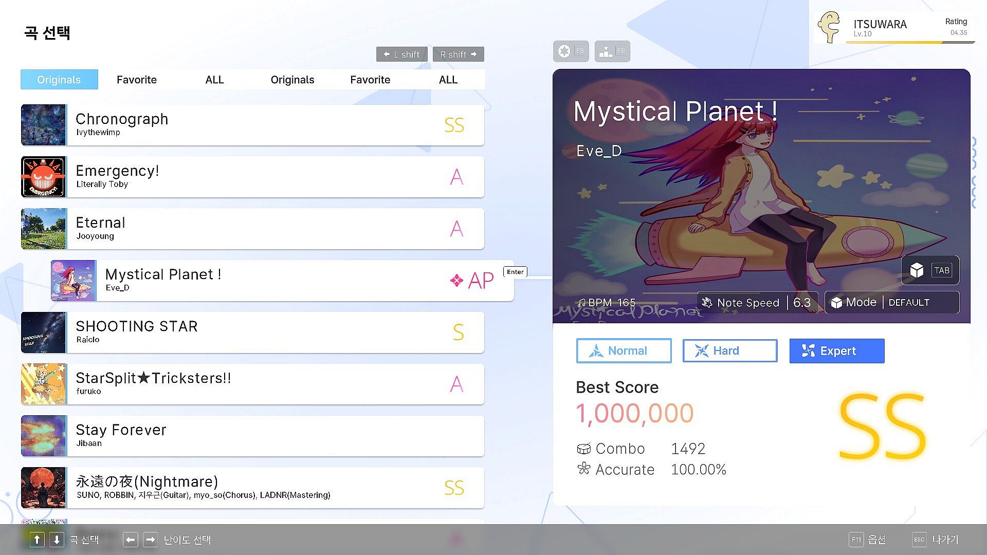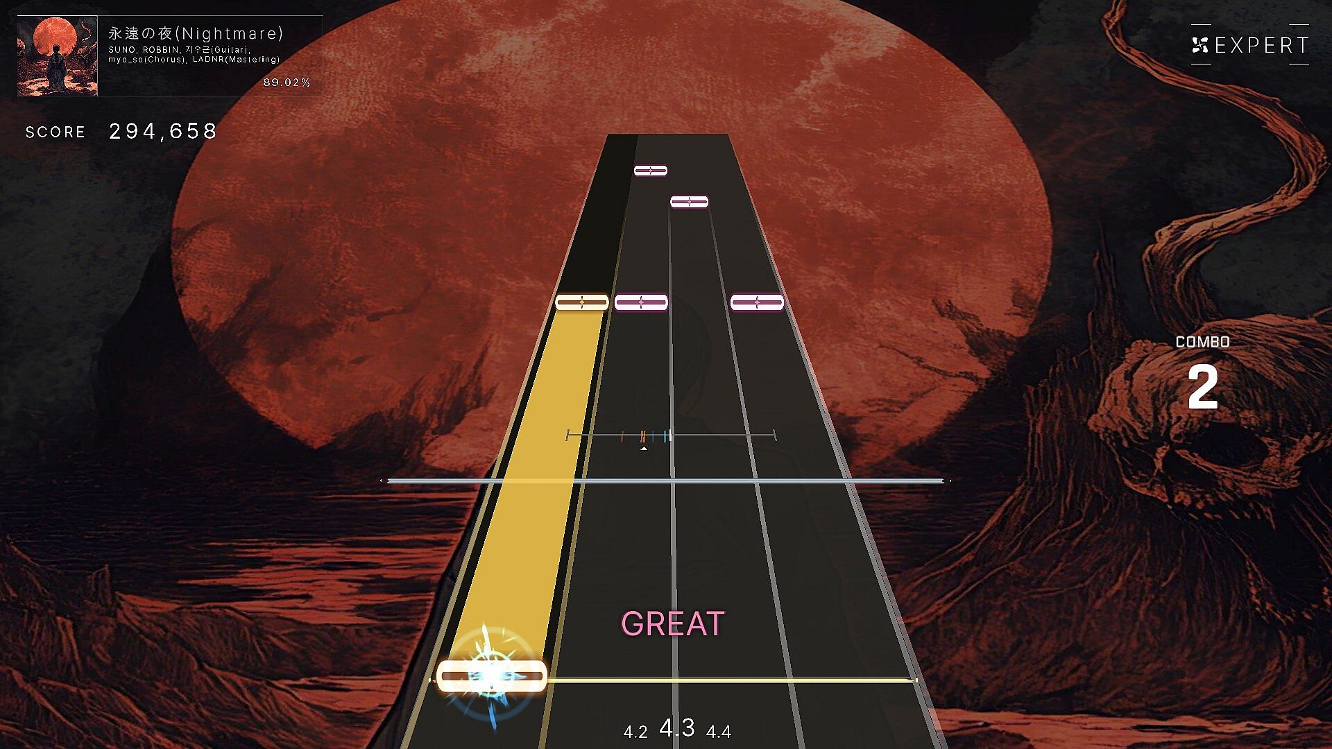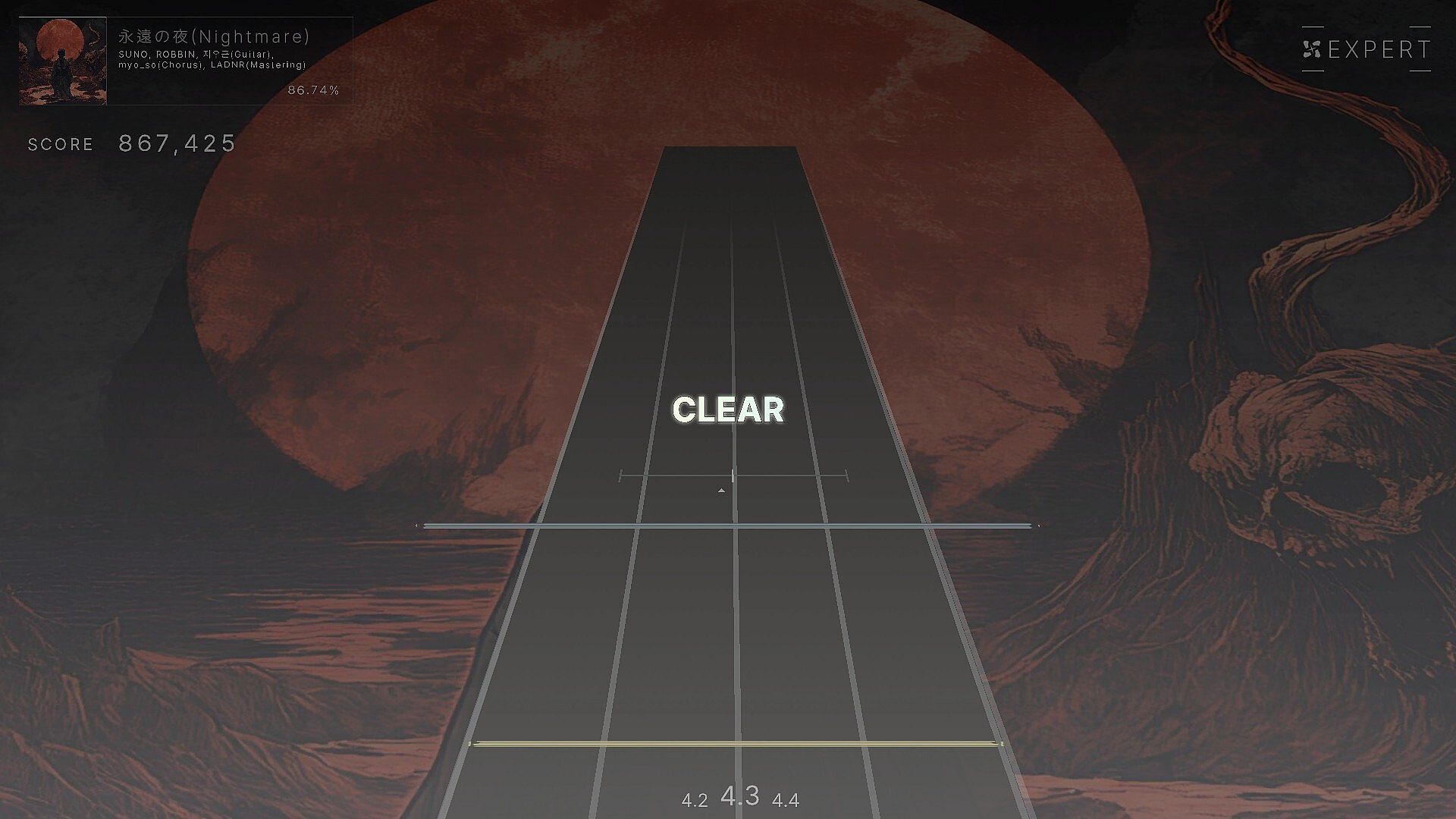 It consists of EASY, NORMAL, and HARD in one song, and it is a basic 4-key falling rhythm game.