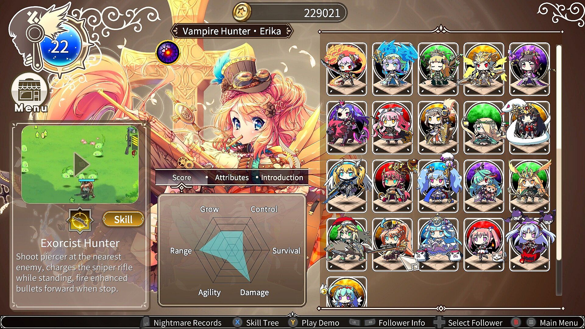 20+ unique characters, each with their own main weapon and skill tree