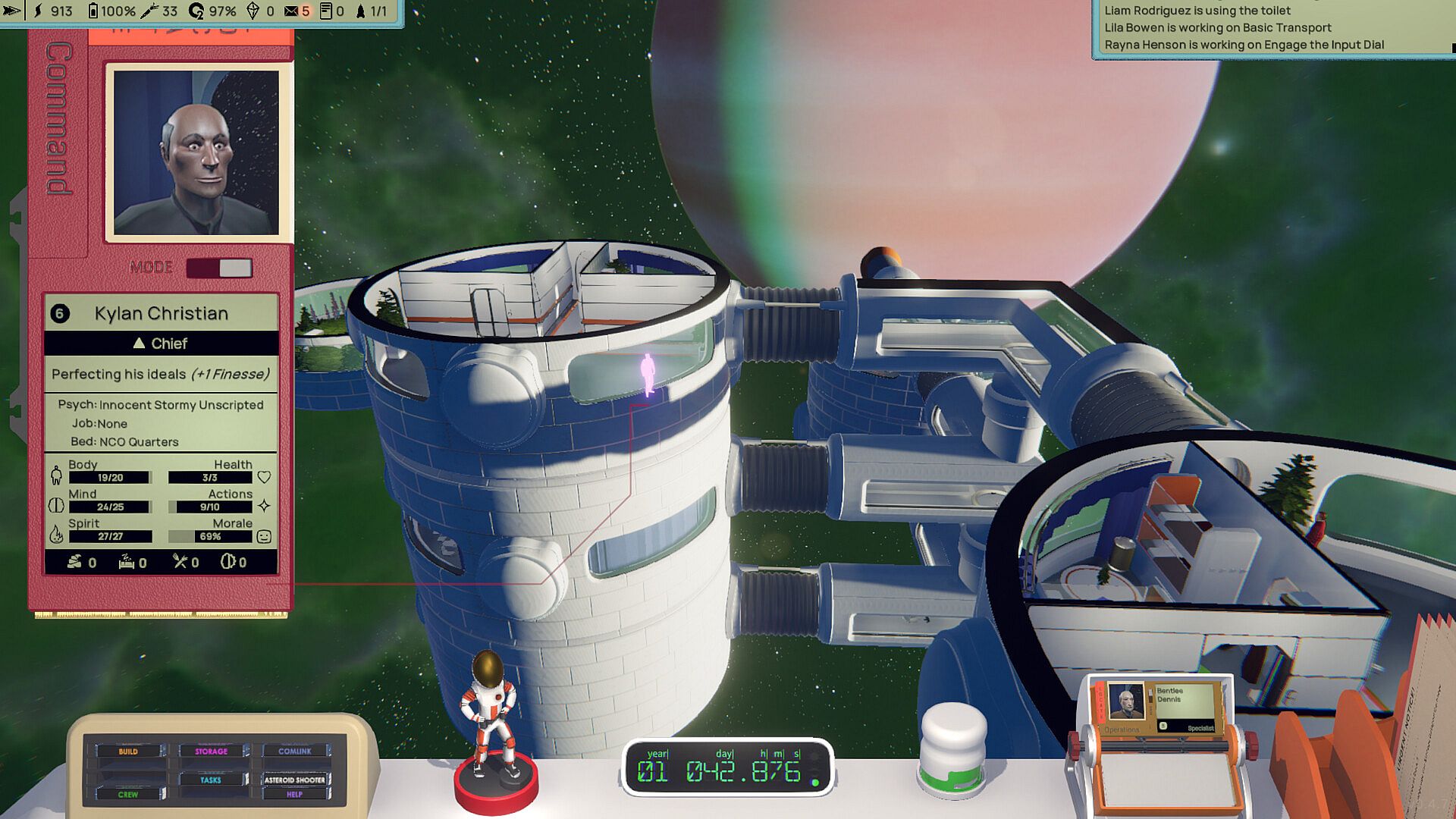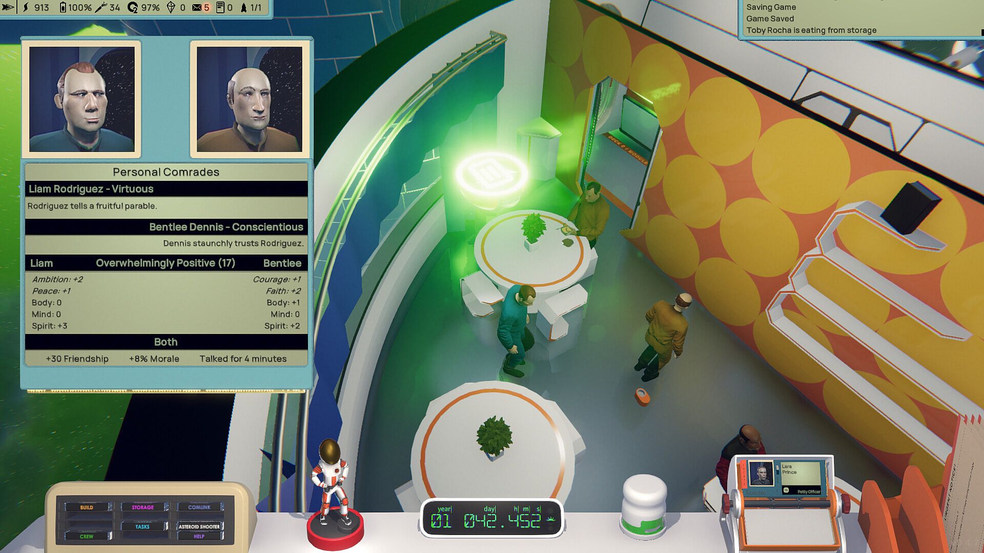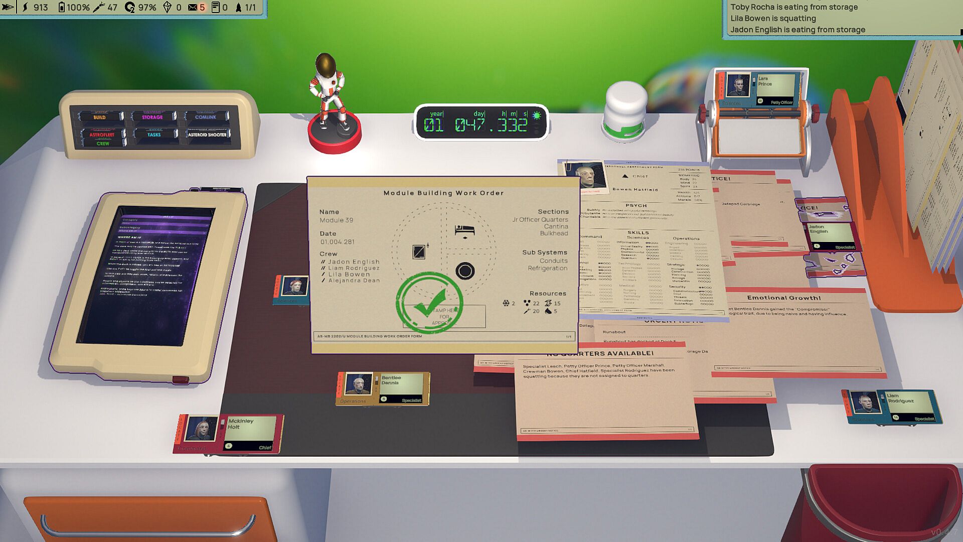 The crew has their own daily lives, routines, and activities on the Astrobase. They work hard to keep your station running and growing, operating the power reactors, performing maintenance tasks, moving resources around the station, going on planetary expeditions, and everything in between. You will find them eating, sleeping, relaxing, and socializing according to their preferences and personalities.