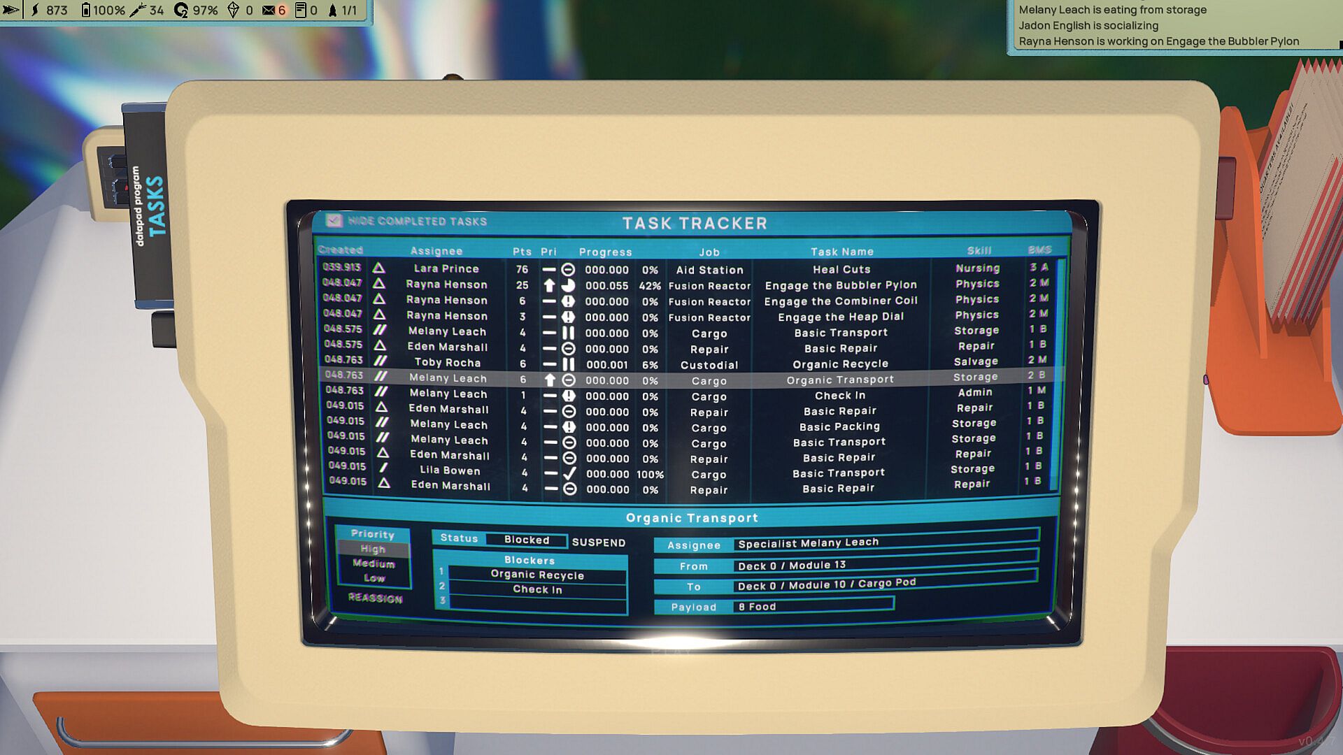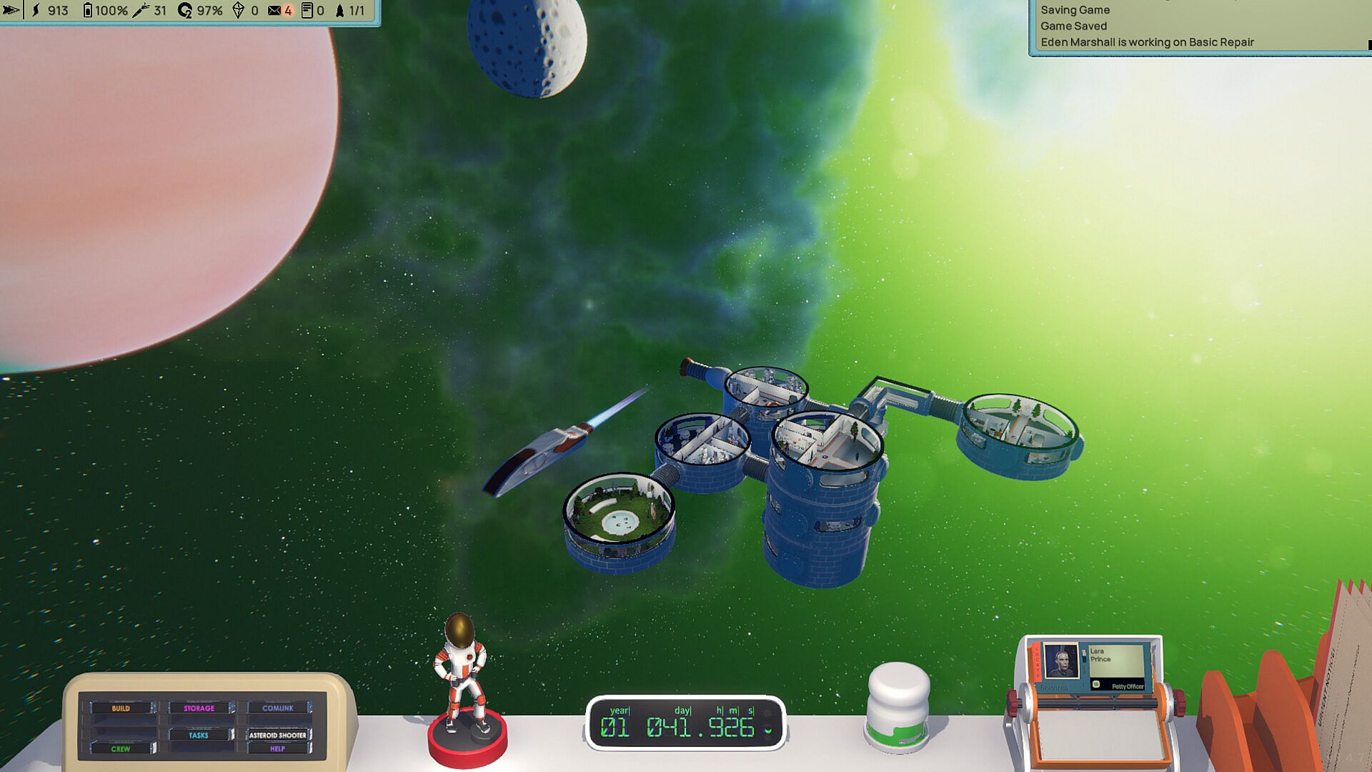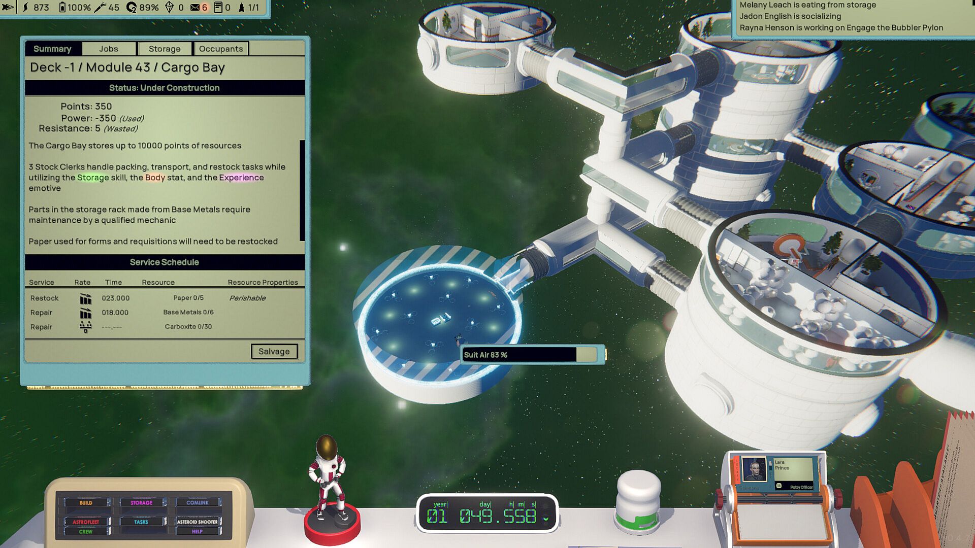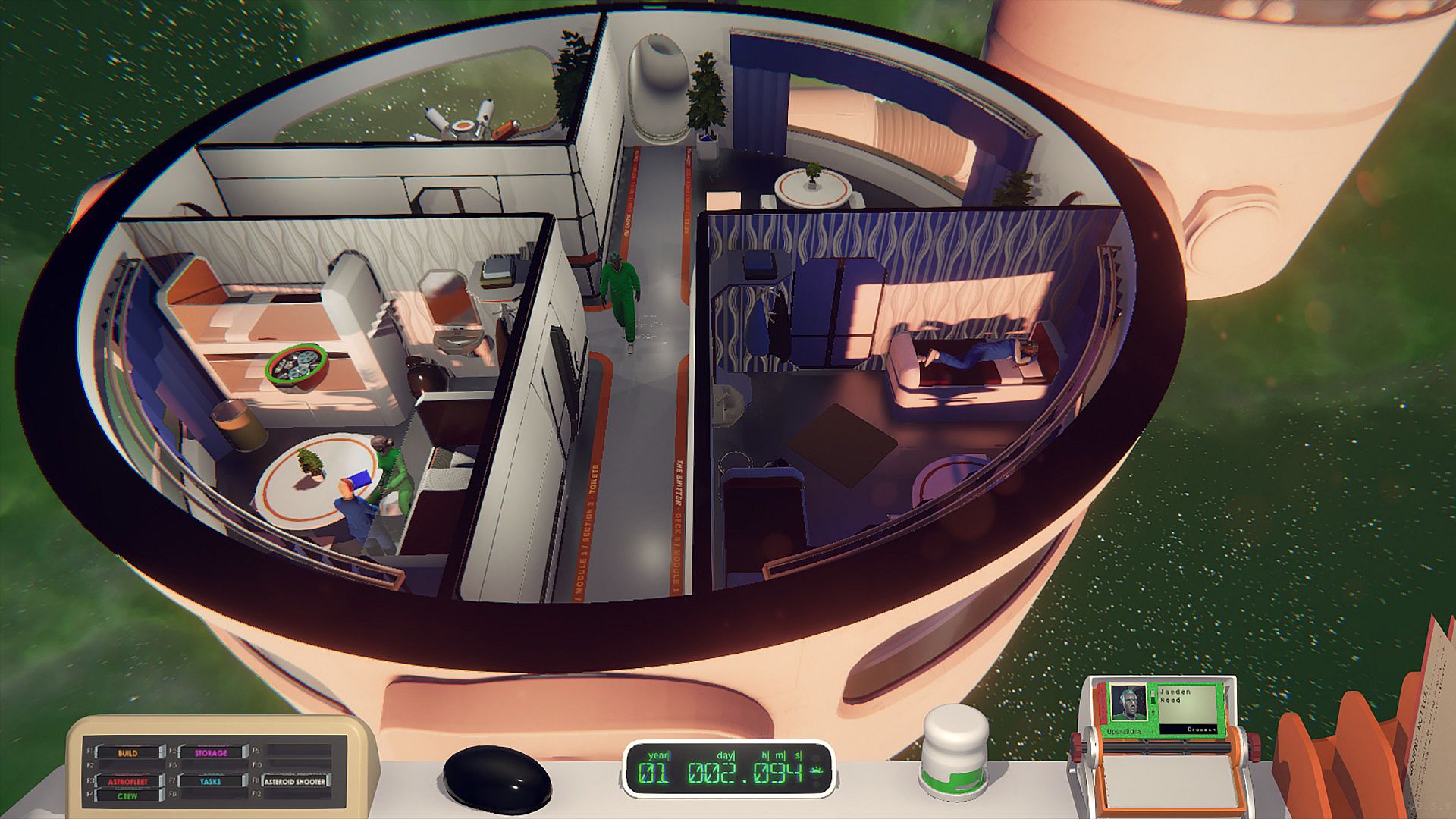 The crew has their own daily lives, routines, and activities on the Astrobase. They work hard to keep your station running and growing, operating the power reactors, performing maintenance tasks, moving resources around the station, going on planetary expeditions, and everything in between. You will find them eating, sleeping, relaxing, and socializing according to their preferences and personalities.