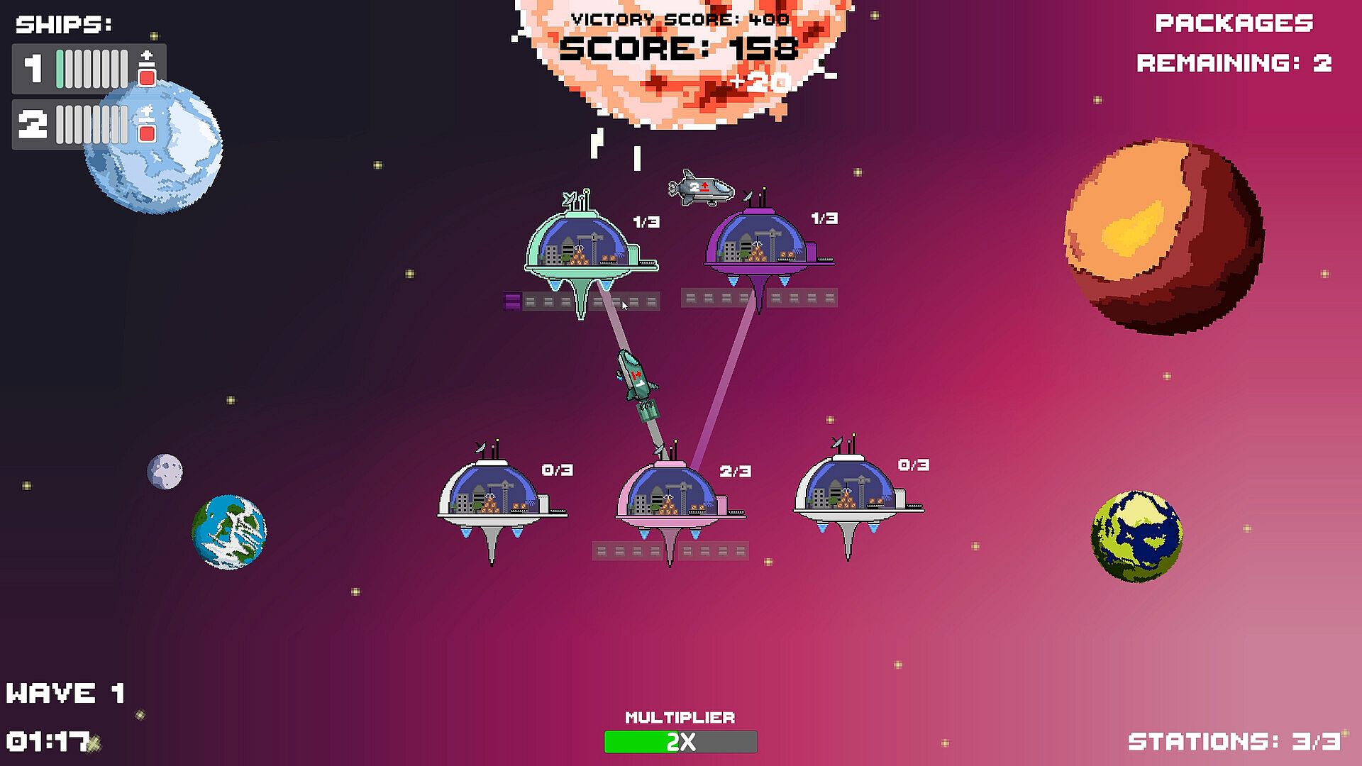 Support efficient deliveries everywhere in your sector by strategically connecting stations. Be wary though, as routes can’t cross each other. Will you better connect important stations or will you be sure packages can get anywhere in your network in reasonable times?