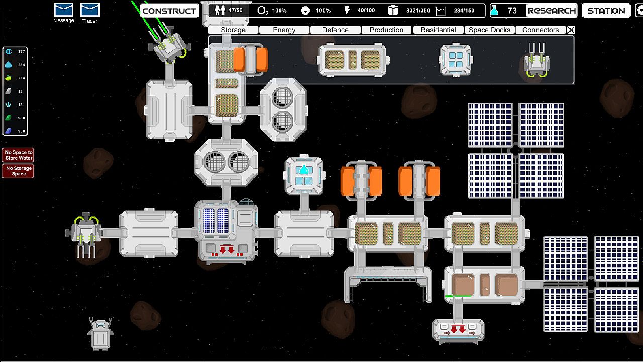Modular components can be added to the space station to things like produce food, filter air, house people and construct new ships. Solar panels can produce energy, research labs unlock new ship designs and improve the efficiency of station modules. The population of the station must be provided with food and water and kept content.AstroMiners is Inspired by games like: