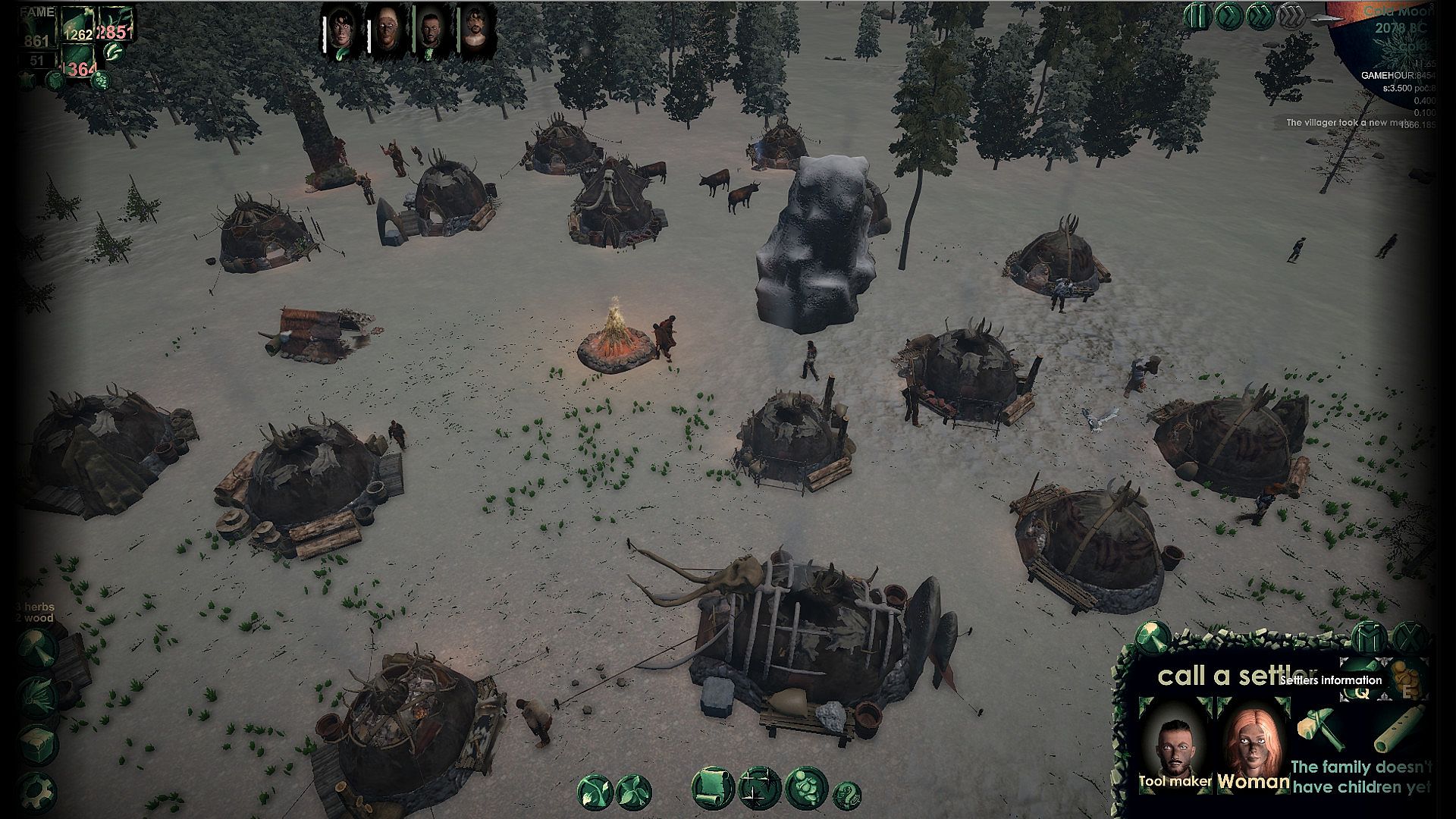 Priests can examine the sun, the moon and the stars. Research will unlock new rituals and larger gatherings. New types of buildings are also unlocked through research. Summon new settlers, their wives, and let the kids train skills with their fathers.