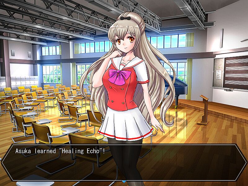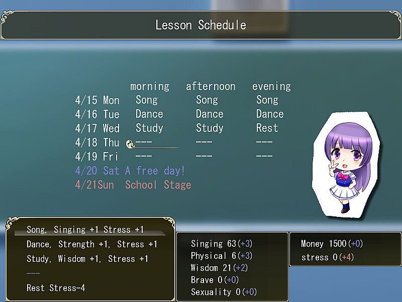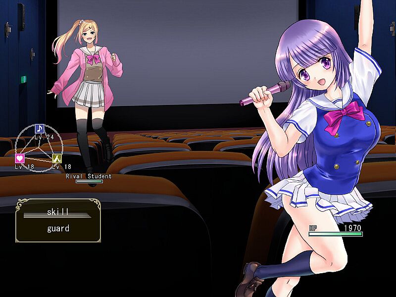 This game is an JRPG. Asuka improves her singing, dancing, and cuteness stats through lessons. These parameters contribute to her Idol Level, which represents her combat strength. In live shows, she faces off against rivals in stage battles.