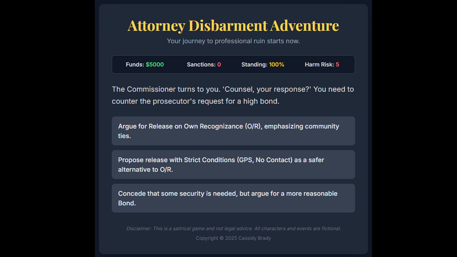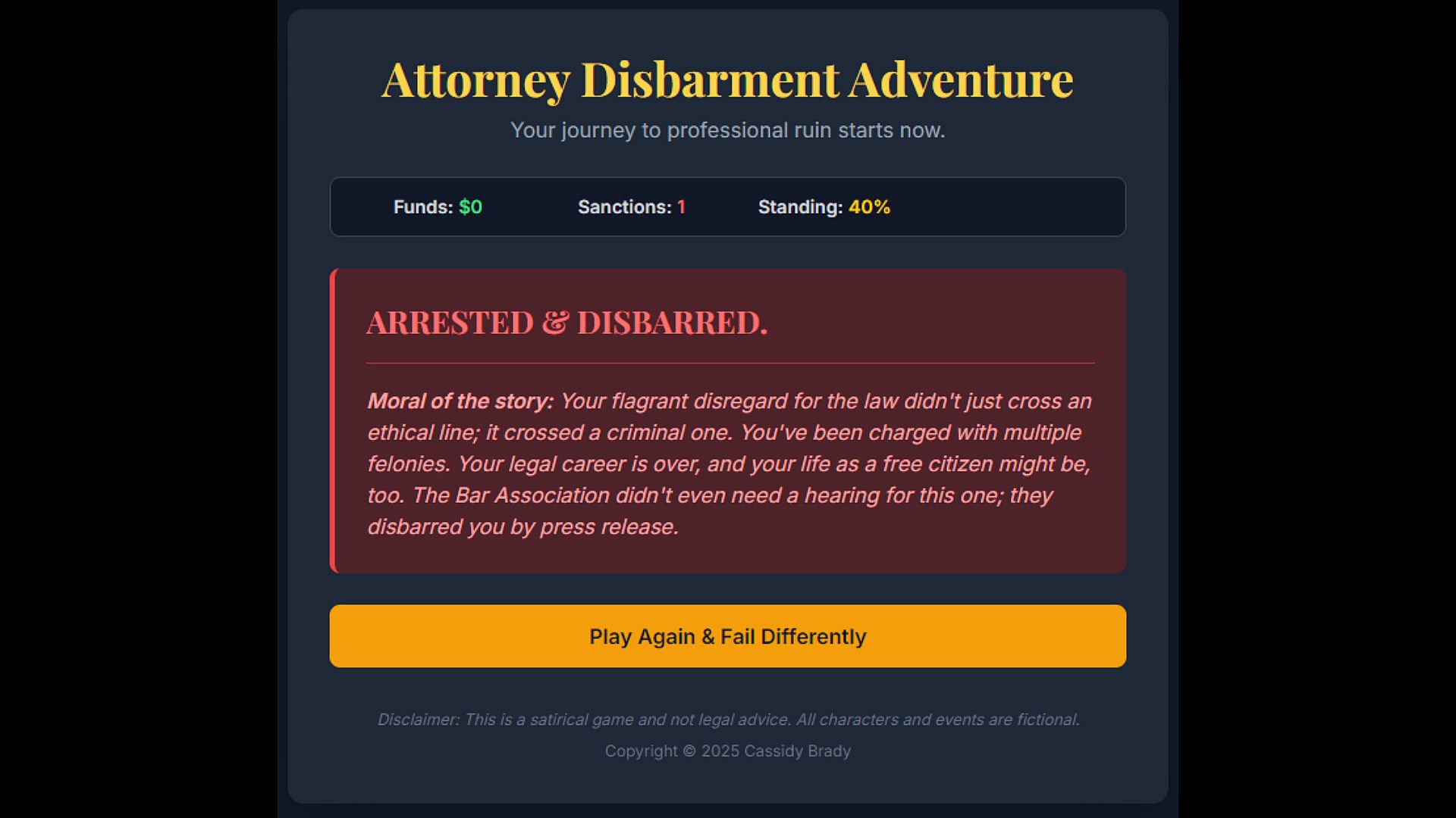 Multiple disbarment endings with collapse journals, achievement tracking for sanction density/failure velocity, practice sandbox, and “fastest implosion” timers.