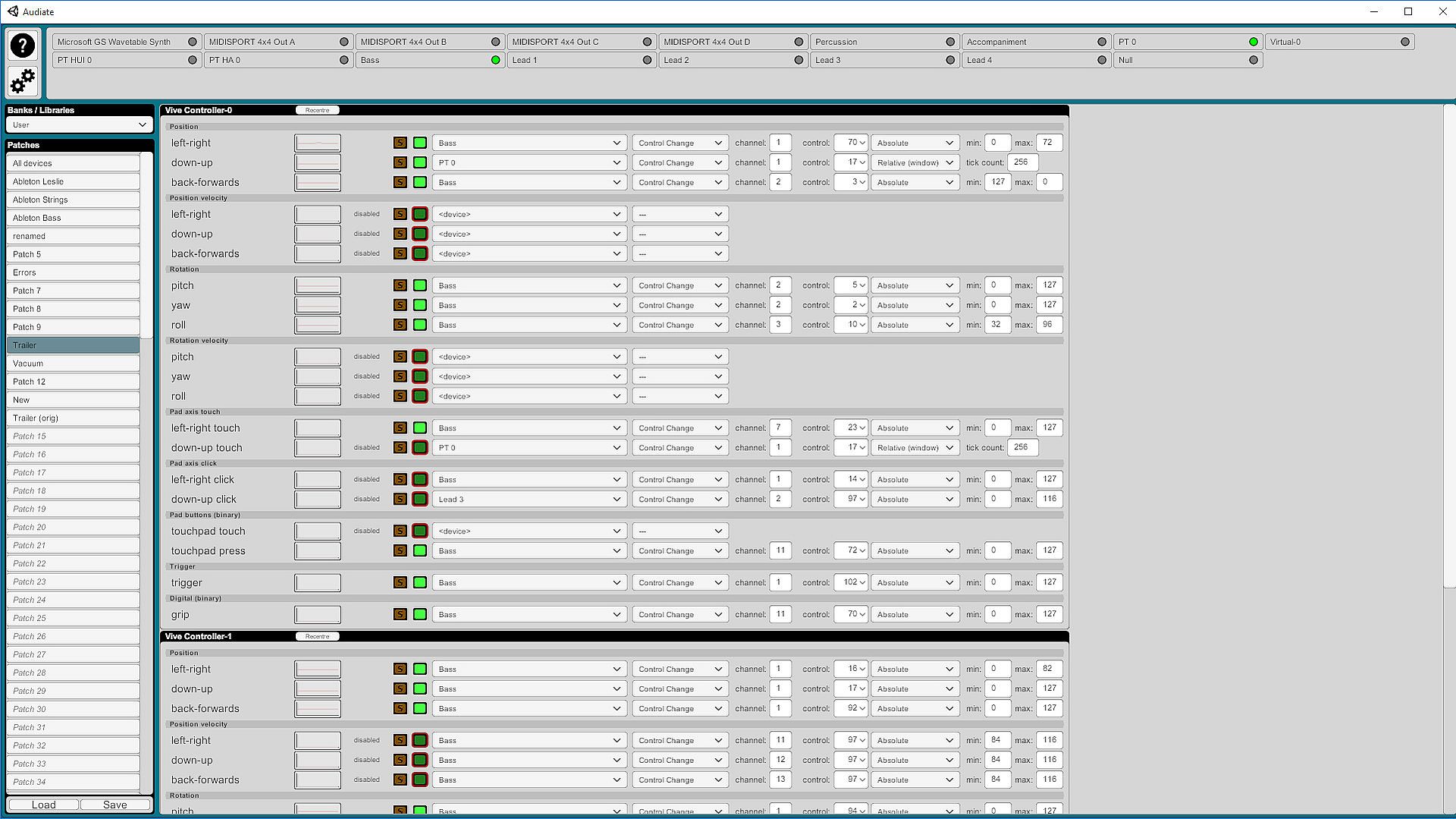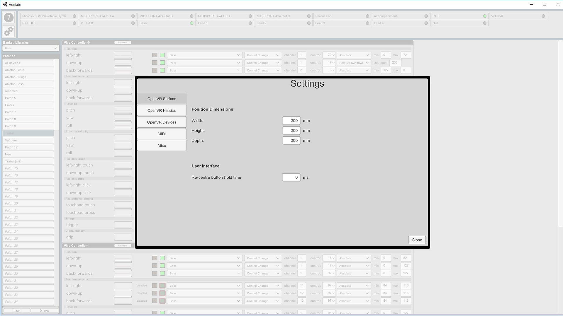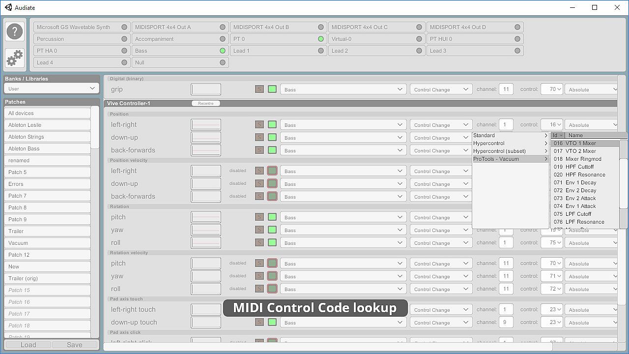 Audiate allows you to map any MIDI-capable audio/video production tool to the position, orientation, and buttons on any OpenVR input device. With six assignable inputs per control from position & rotation alone it provides far more control per hand than would be possible with traditional finger-operated faders, knobs, & modwheels.