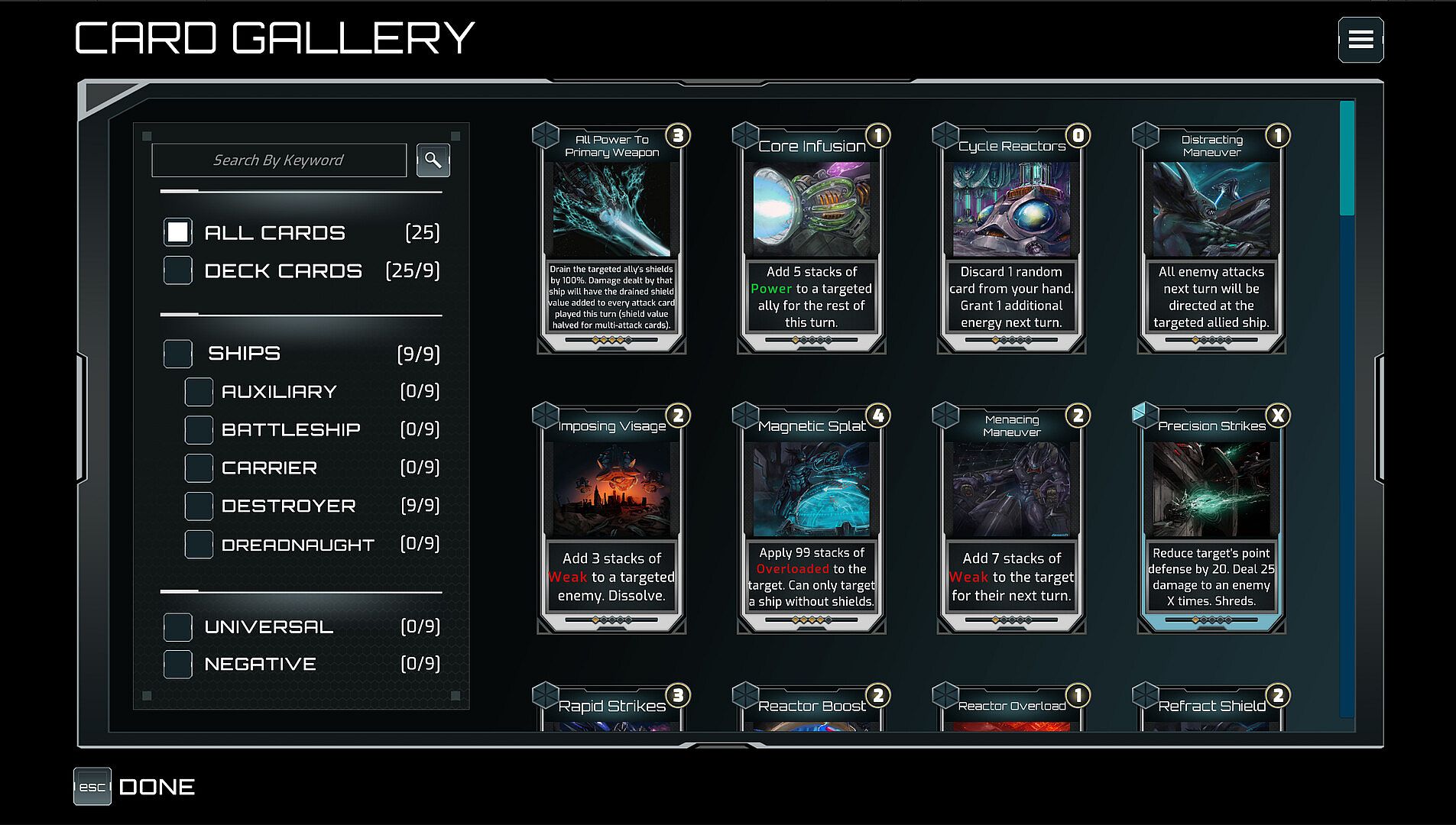Assemble your task force. Gather weaponry and abilities through cards. Modify your ship's capabilities with special technology called Augmentations. React to a changing battlefield with an array of collectible items. Enhance your ship's attributes to make them stronger and deadlier.