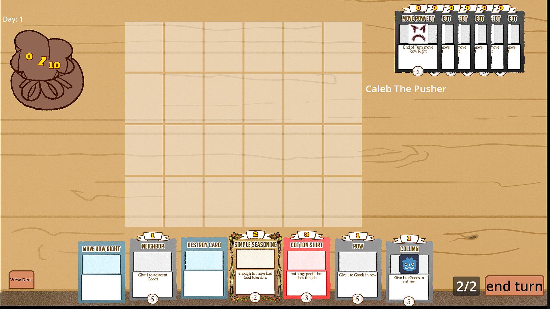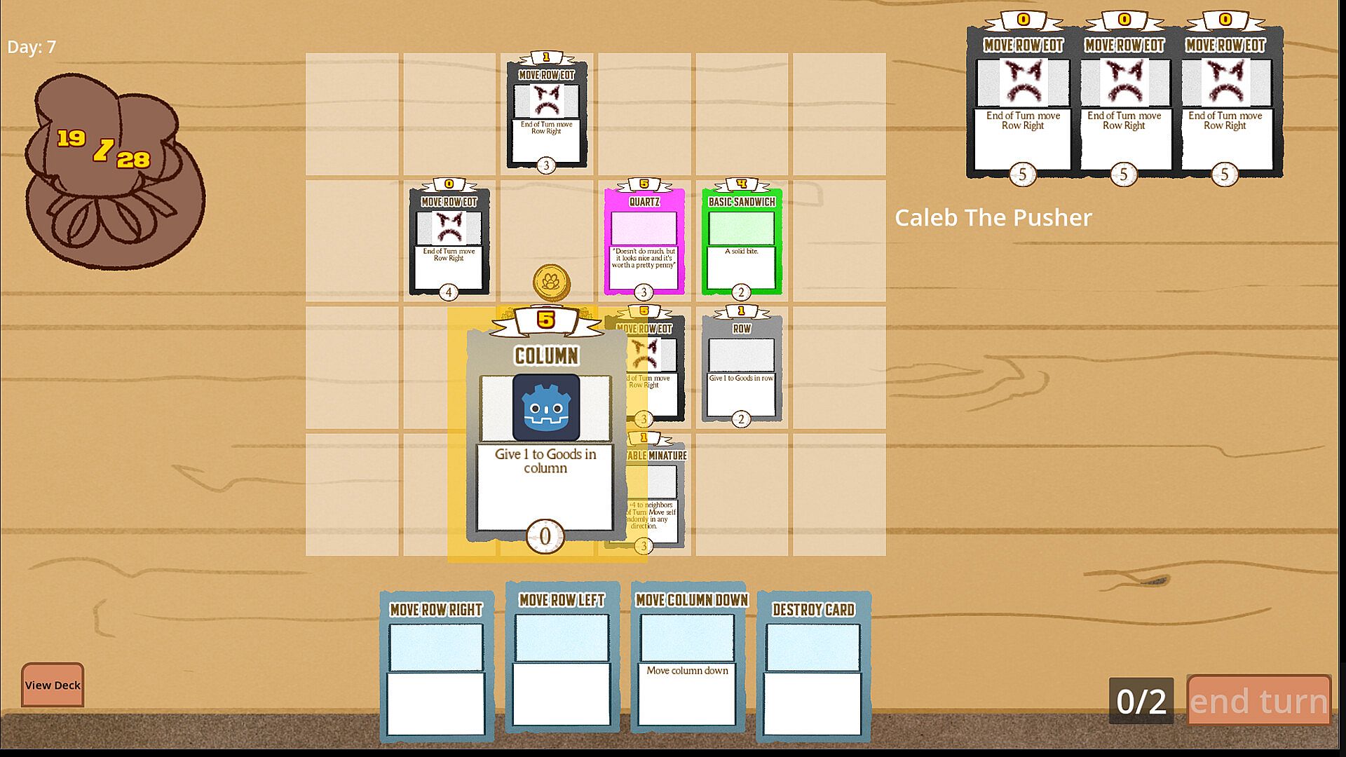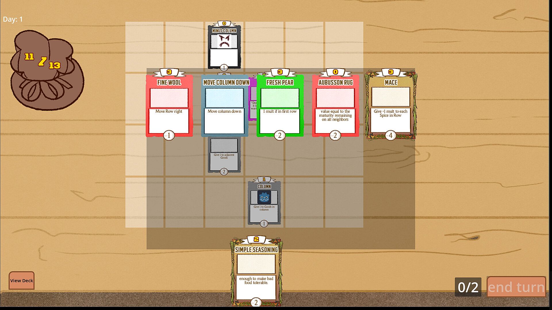 Place your good out on your display table to get them ready to sell! When their sale date hits 0, the card gets sold for its value. Place your cards down where their value will be highest, and move the rows and columns to get them in the perfect spot. Buff the power of a row or a column or many other effects to boost the worth of your goods. Where you place your goods can be the difference between a successful store and bankruptcy!