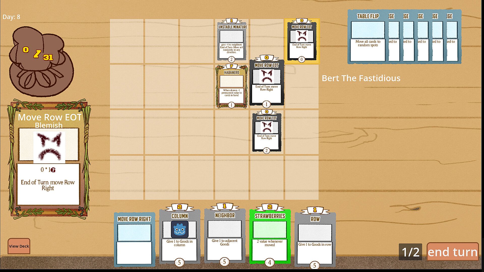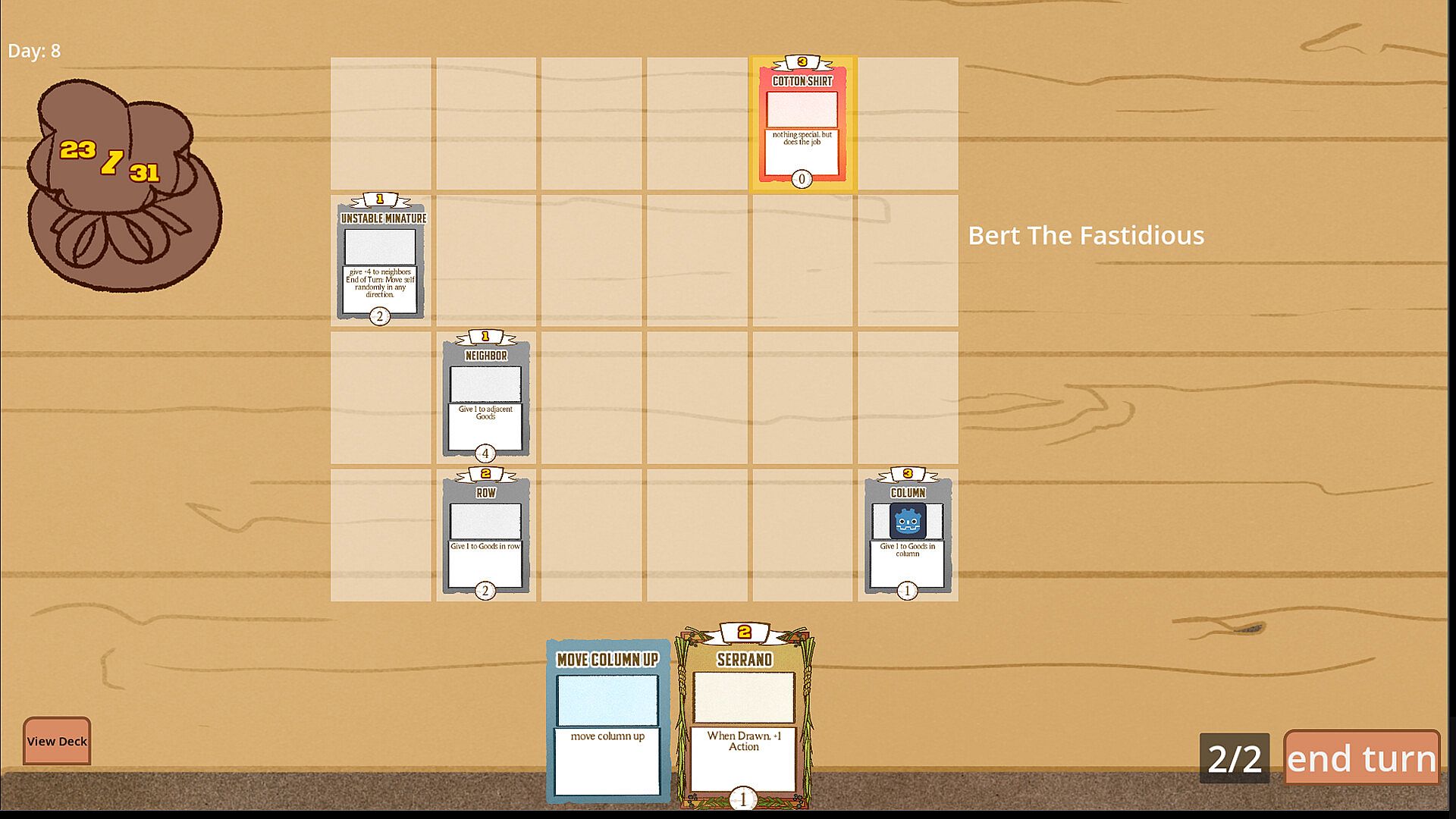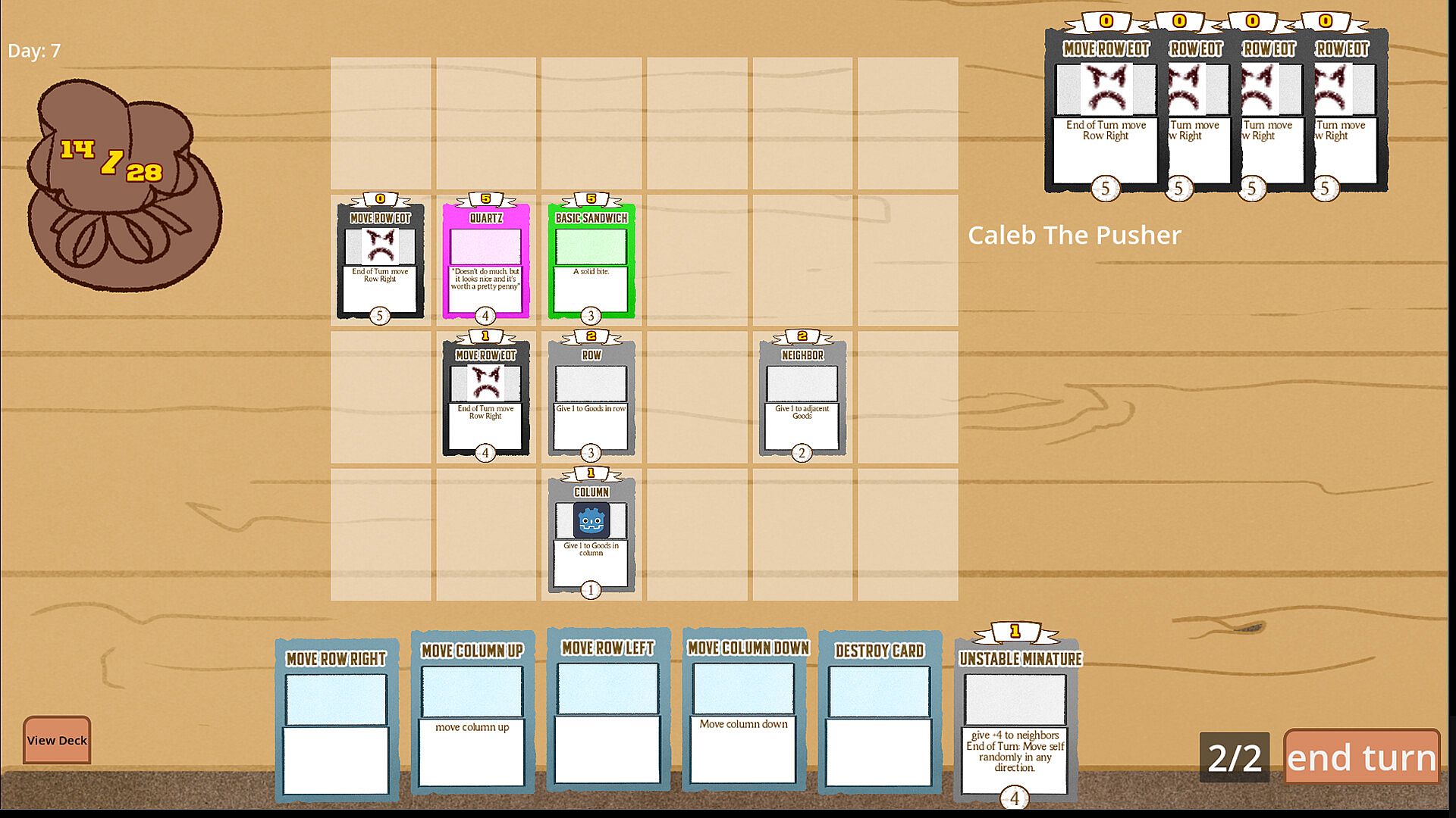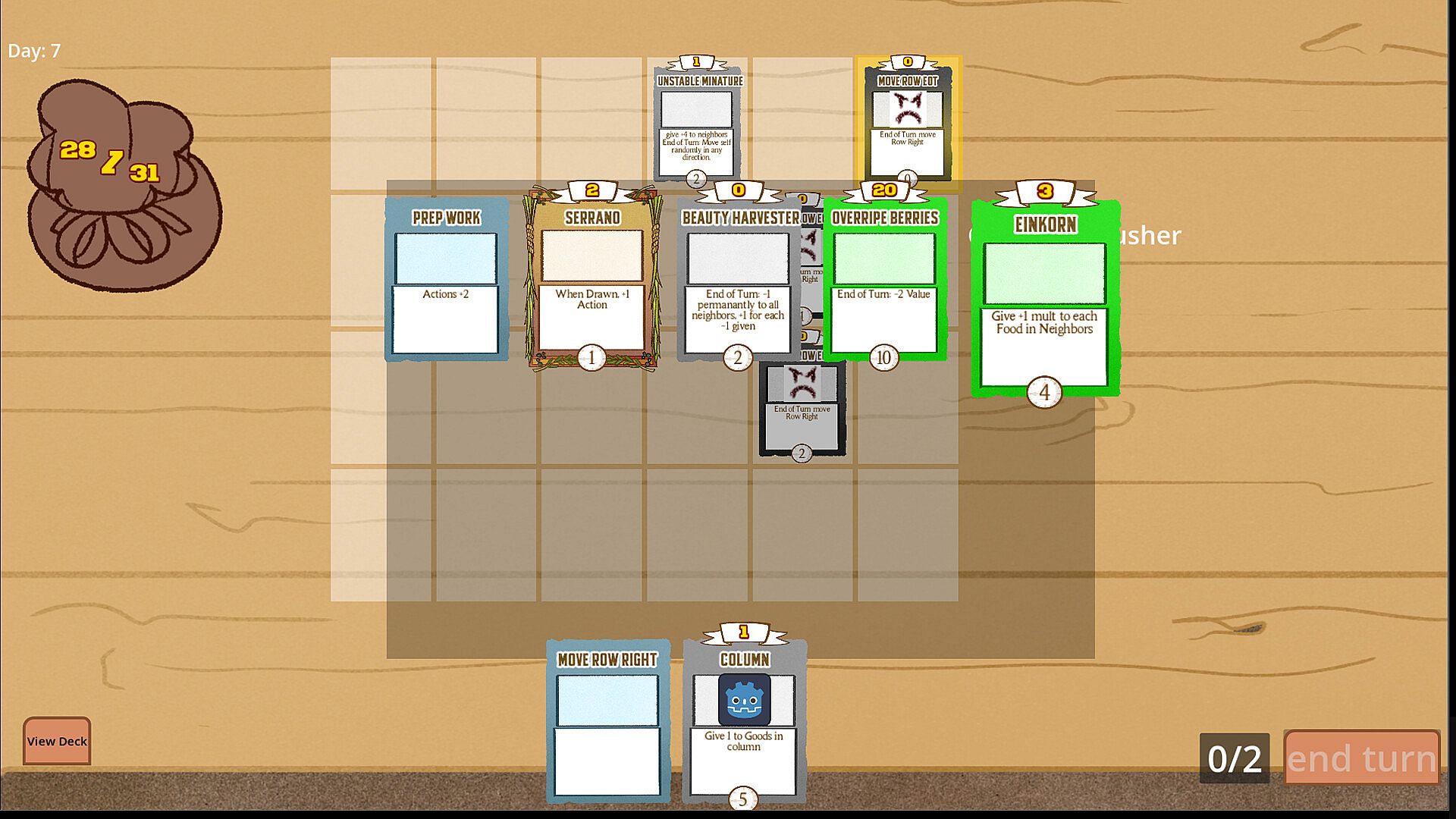 Place your good out on your display table to get them ready to sell! When their sale date hits 0, the card gets sold for its value. Place your cards down where their value will be highest, and move the rows and columns to get them in the perfect spot. Buff the power of a row or a column or many other effects to boost the worth of your goods. Where you place your goods can be the difference between a successful store and bankruptcy!