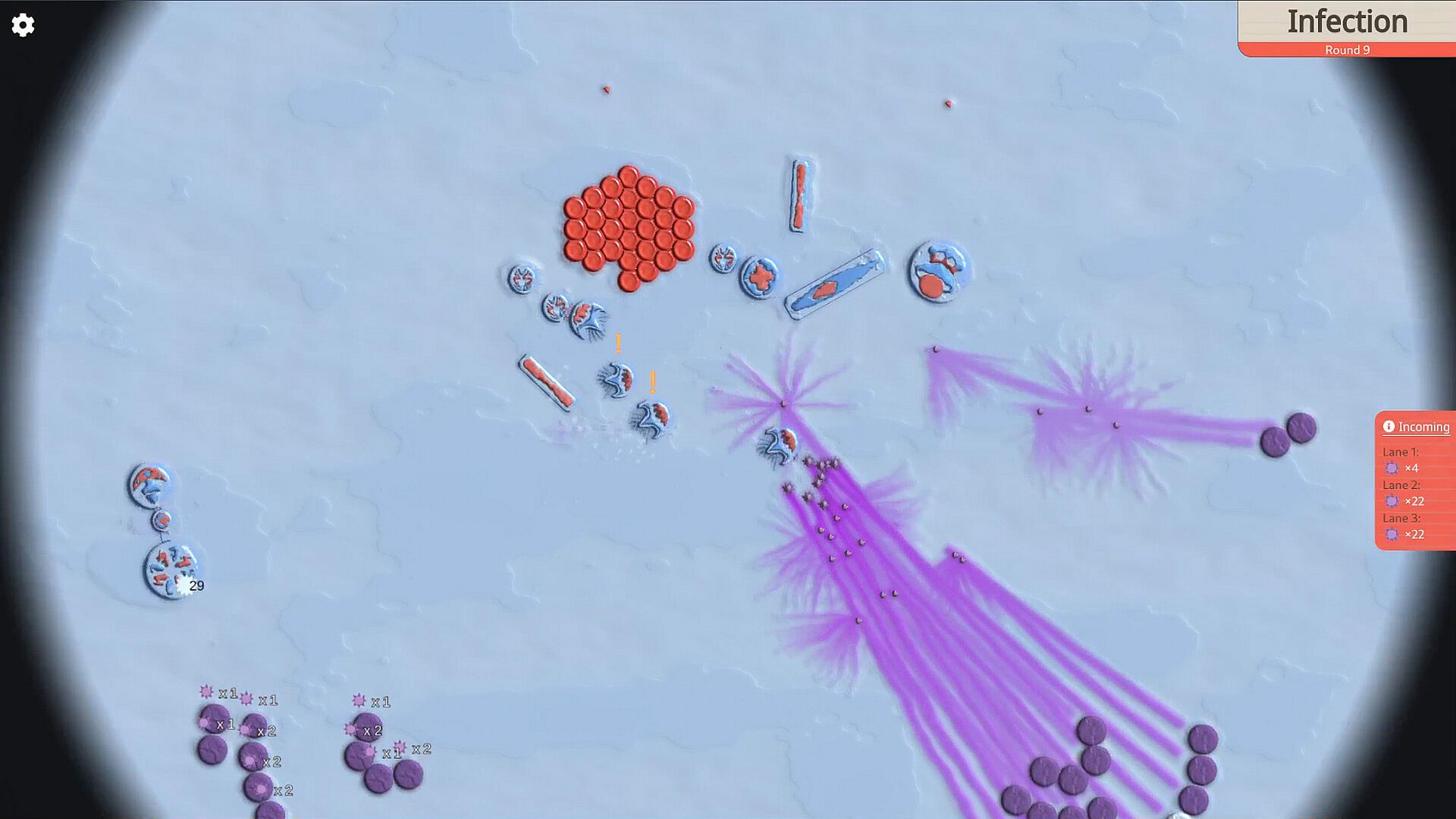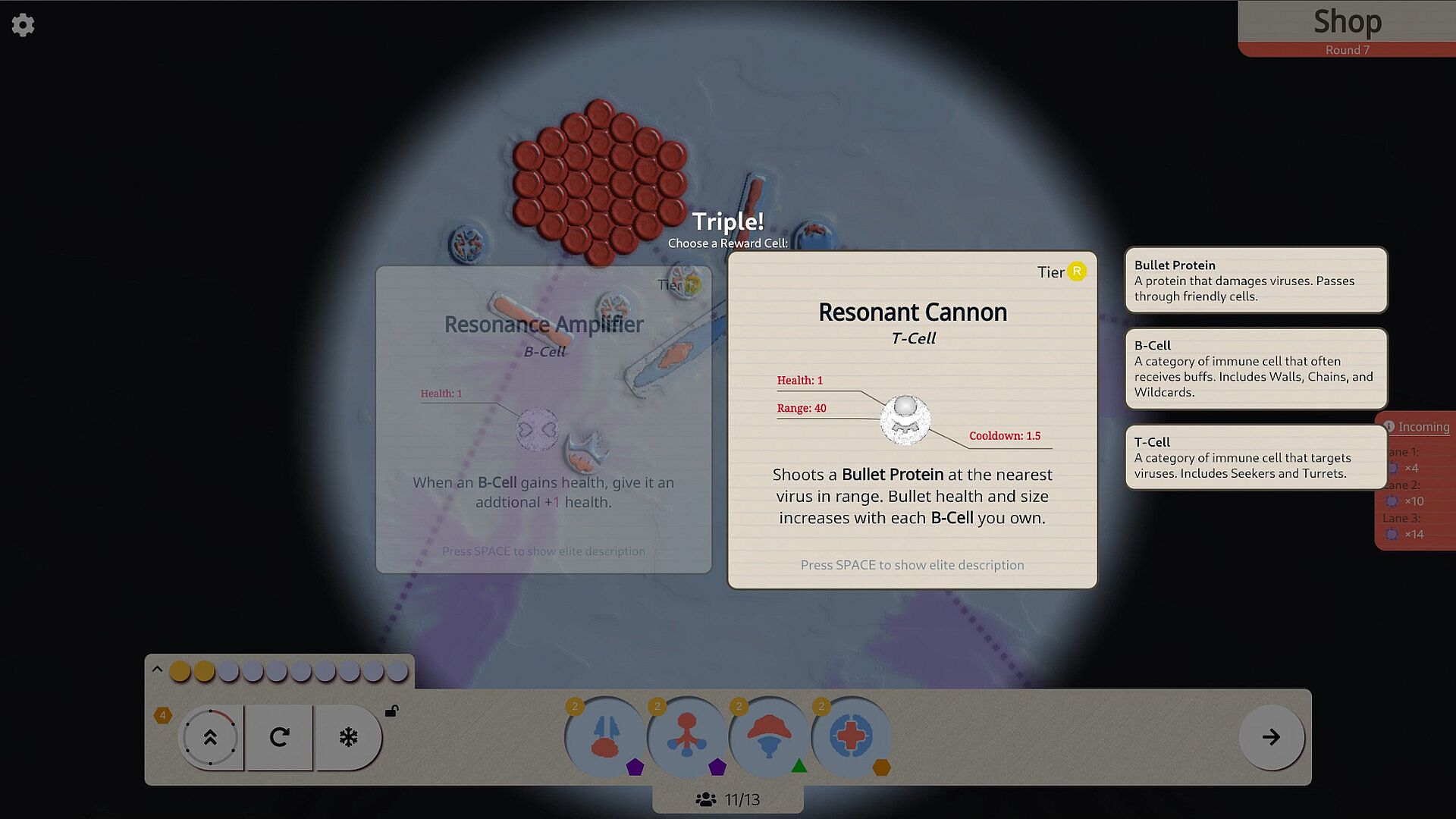 Create the ultimate immune response: Combine immune cells in interesting ways to overcome incoming pathogens. Merging the same immune cells together will strengthen them and can unlock higher tier immune cells to experiment with. Chaining different cells together can reveal powerful synergies.