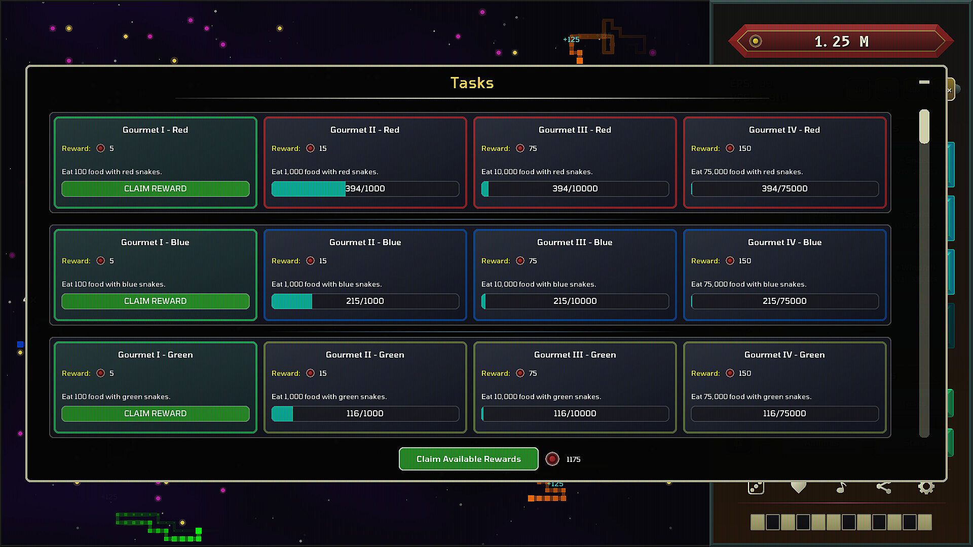 Relax with Auto Snakes in Outer Space! A slow, meditative, and mesmerizing incremental idler where colorful snakes automatically collect food. The player's goal is to make them more efficient.