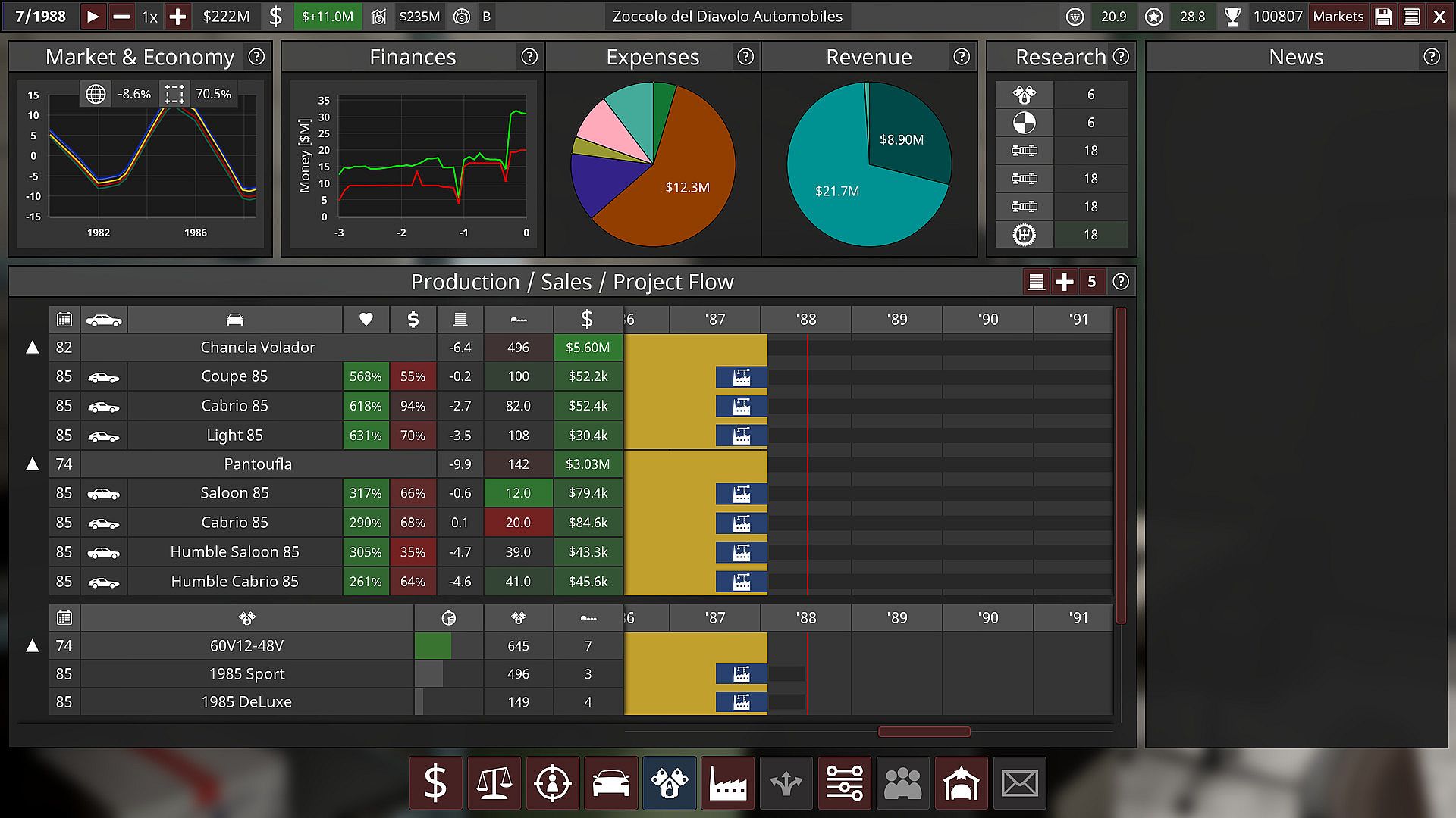 Automation’s Campaign Mode starts in 1946, where players test their design skills in a deep simulation of the automotive industry. Build factories and equip them with the facilities and equipment they need, and research cutting-edge technologies to turn your fledgling company into a titan of the industry, by catering to the needs and desires of dynamically-simulated market demographics.