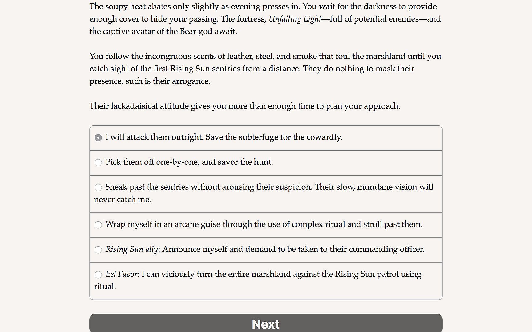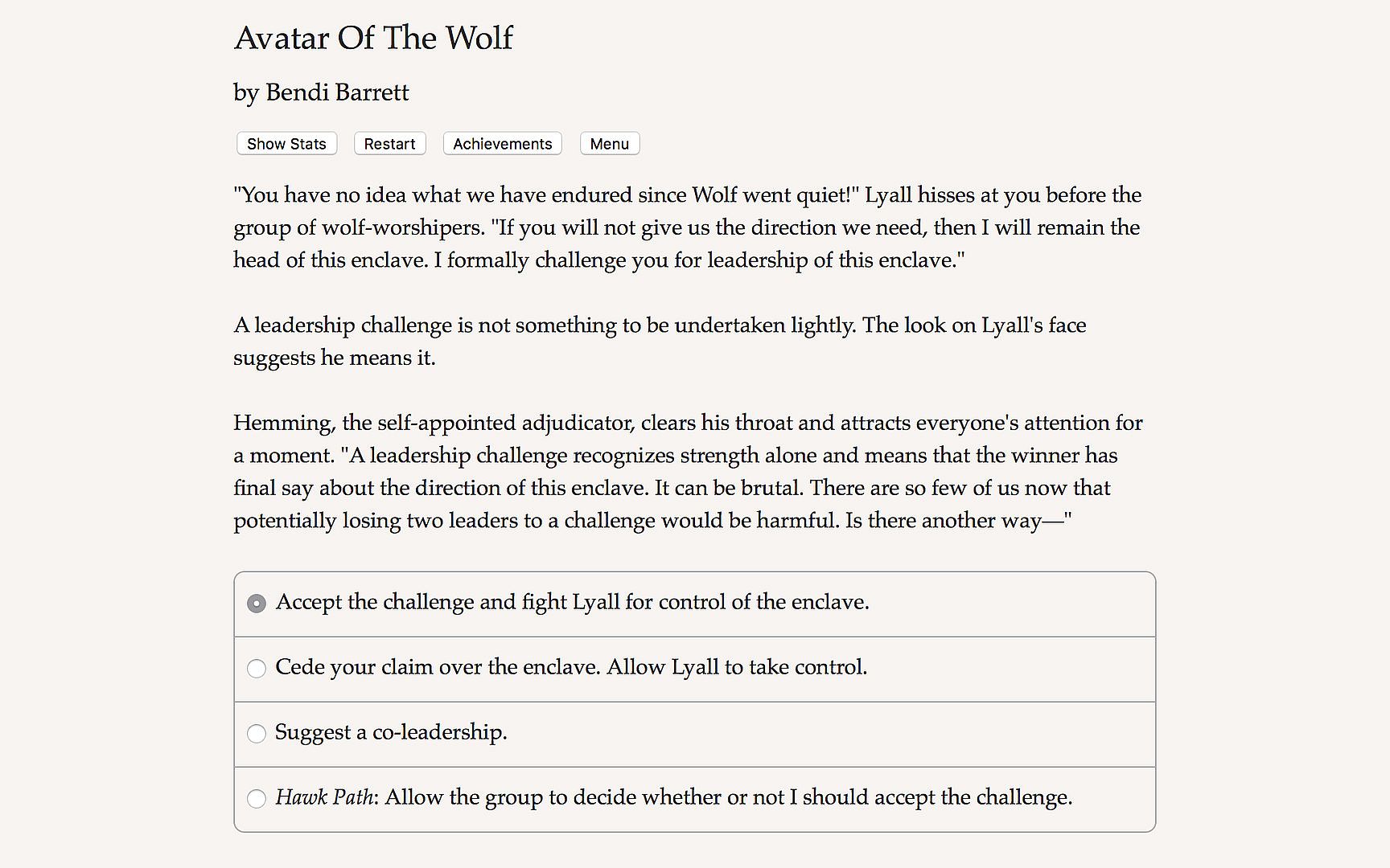Avatar of the Wolf is a 135,000-word interactive fantasy novel by Bendi Barrett. It's entirely text-based, without graphics or sound effects, and fueled by the vast, unstoppable power of your imagination.