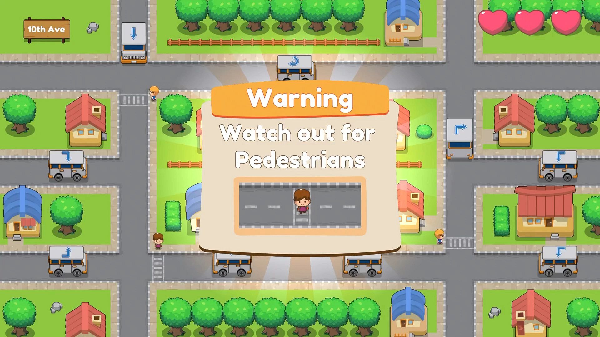 Think ahead, time your moves carefully and avoid accidents as you navigate tricky intersections and unpredictable crosswalks. Try to clear each stage in the fewest lives possible, but don’t worry too much, as levels can be tried as many times as it takes.