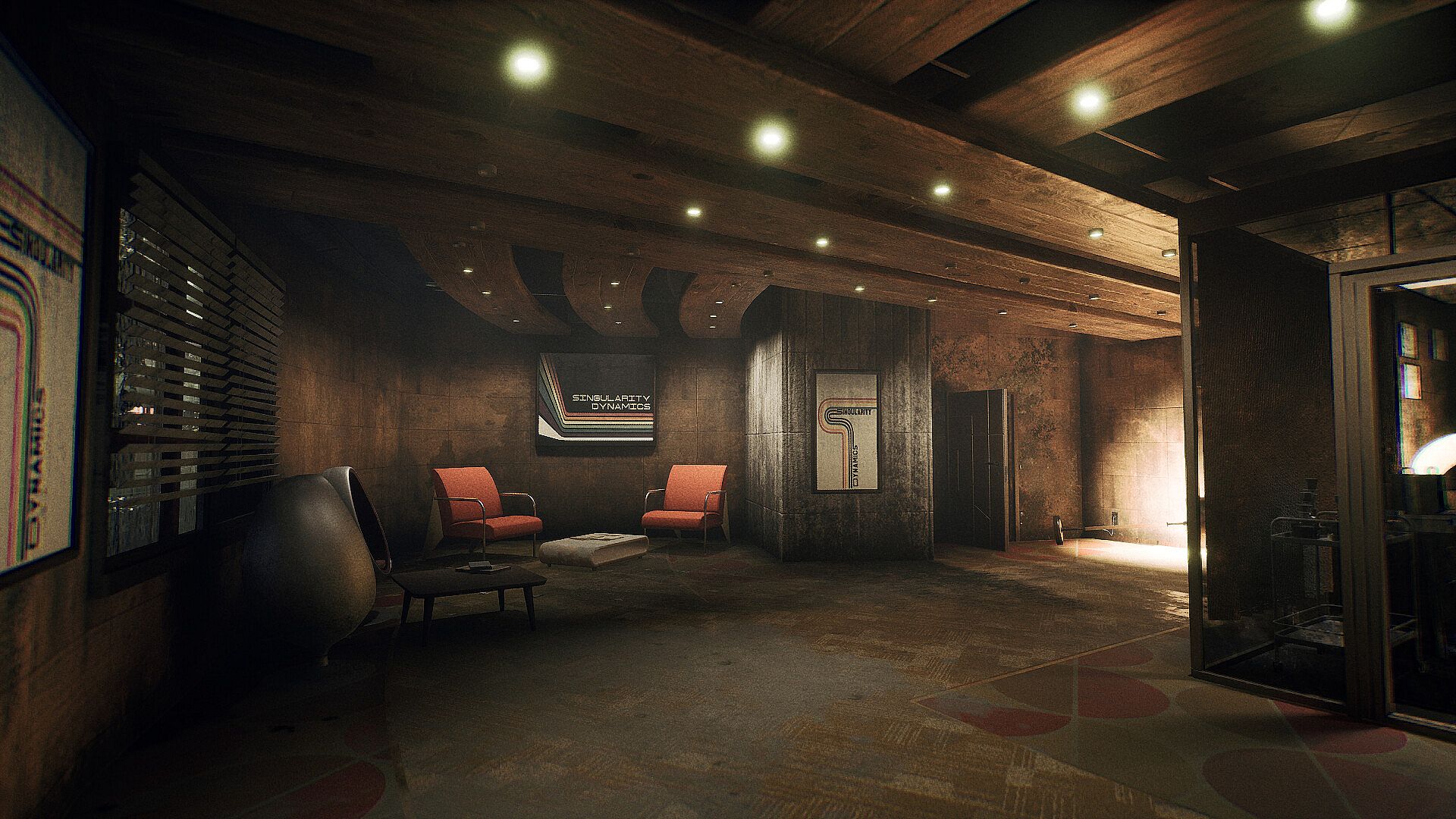 Wood Panels with Analog tech, cathode screens, and research facilities Inspired by the Tech corporations of the 70s and 80s like IBM, XEROX, APPLE .This colourful aesthetic clashes with the abandoned and deserted structures.