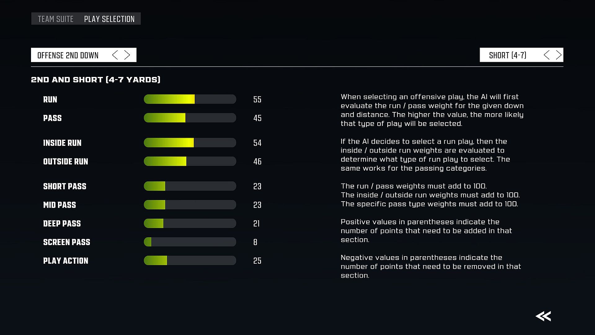 - Team playcalling strategy editor: change which types of plays are called on a variety of down and distances.