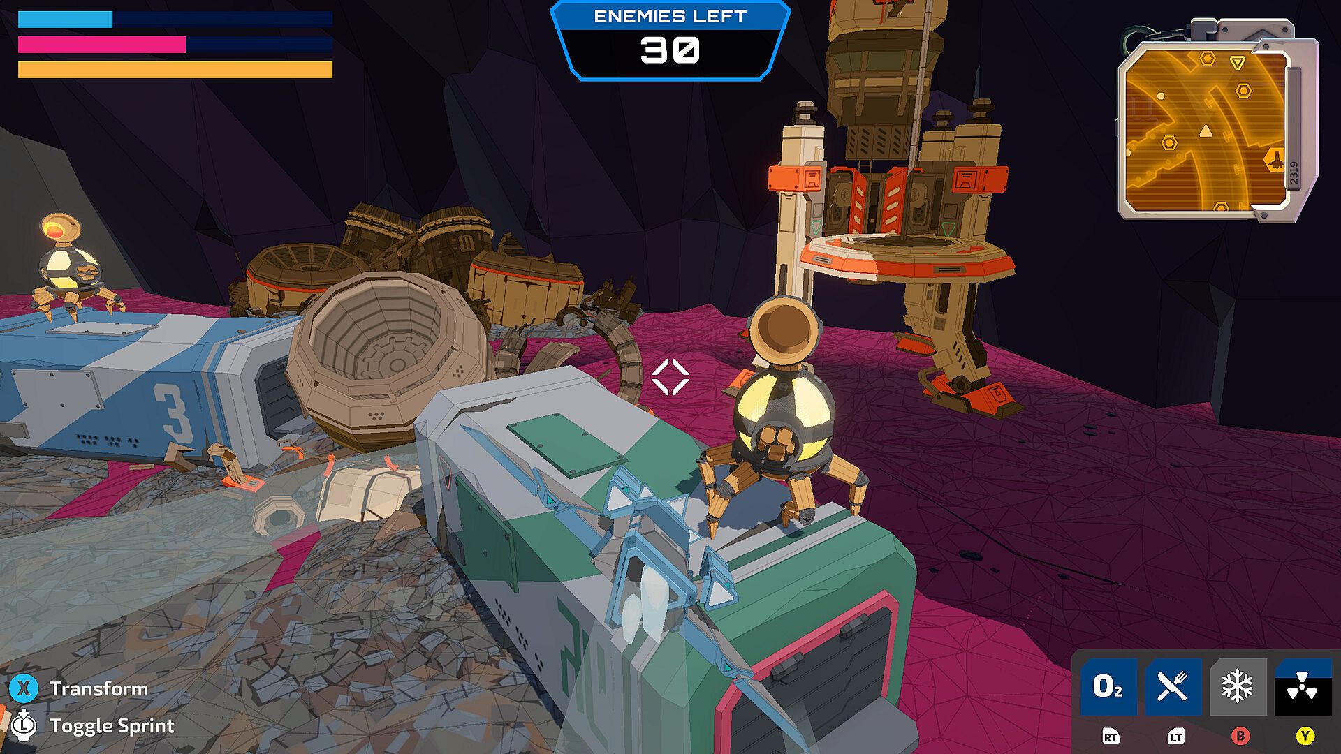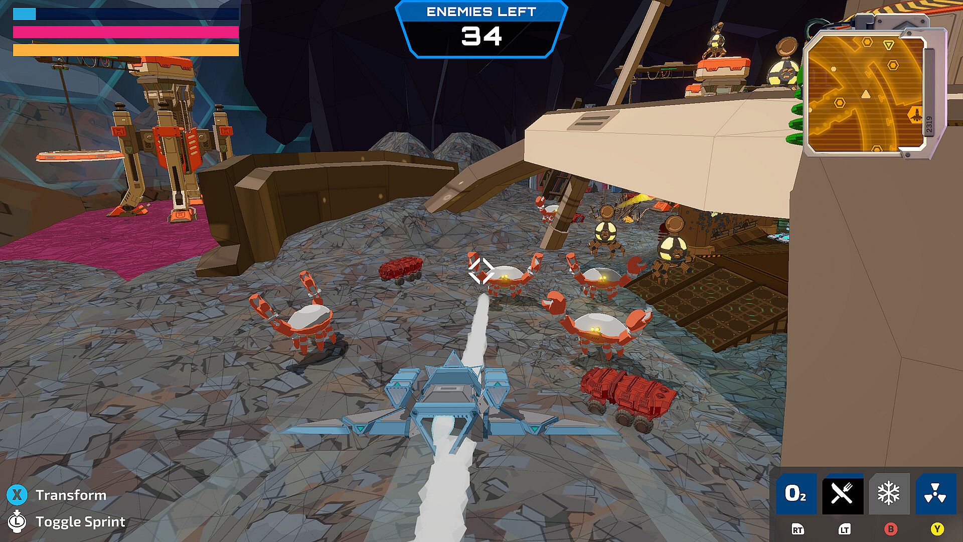 Transform: Seamlessly and instantly switch between three distinct vehicle forms, each equipped with its own abilities, weapons, and playstyle.
