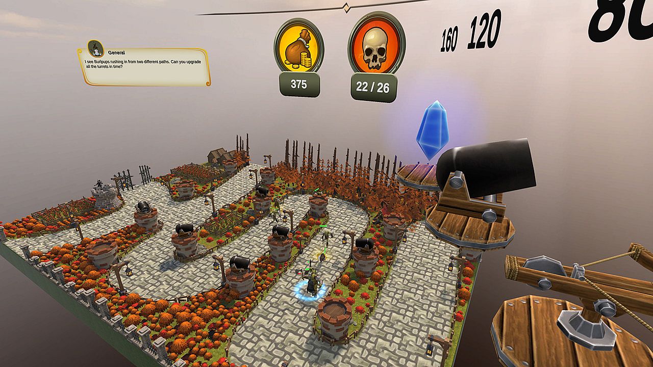 Command Burlpups and Royal Guard units to defend Zalolo Land in this VR tower defense game. Hordes of orcs with zombie-like mythical creatures swarm from every direction across medieval maps like forests, lakesides, and castles. Build towers on the fly, upgrade them through three levels, and earn gold from kills to sell or reinforce defenses while adapting to enemy behaviors. Fight over 30 ground and flying Burlpups on eight stylized three-dimensional vertical maps in a tabletop VR setup. Command your hero in immersive battles with a single VR controller, exploring a unique storyline amid 7+ hours of gameplay and 15 achievements. New to VR? This strategy title eases you into perfecting defenses.