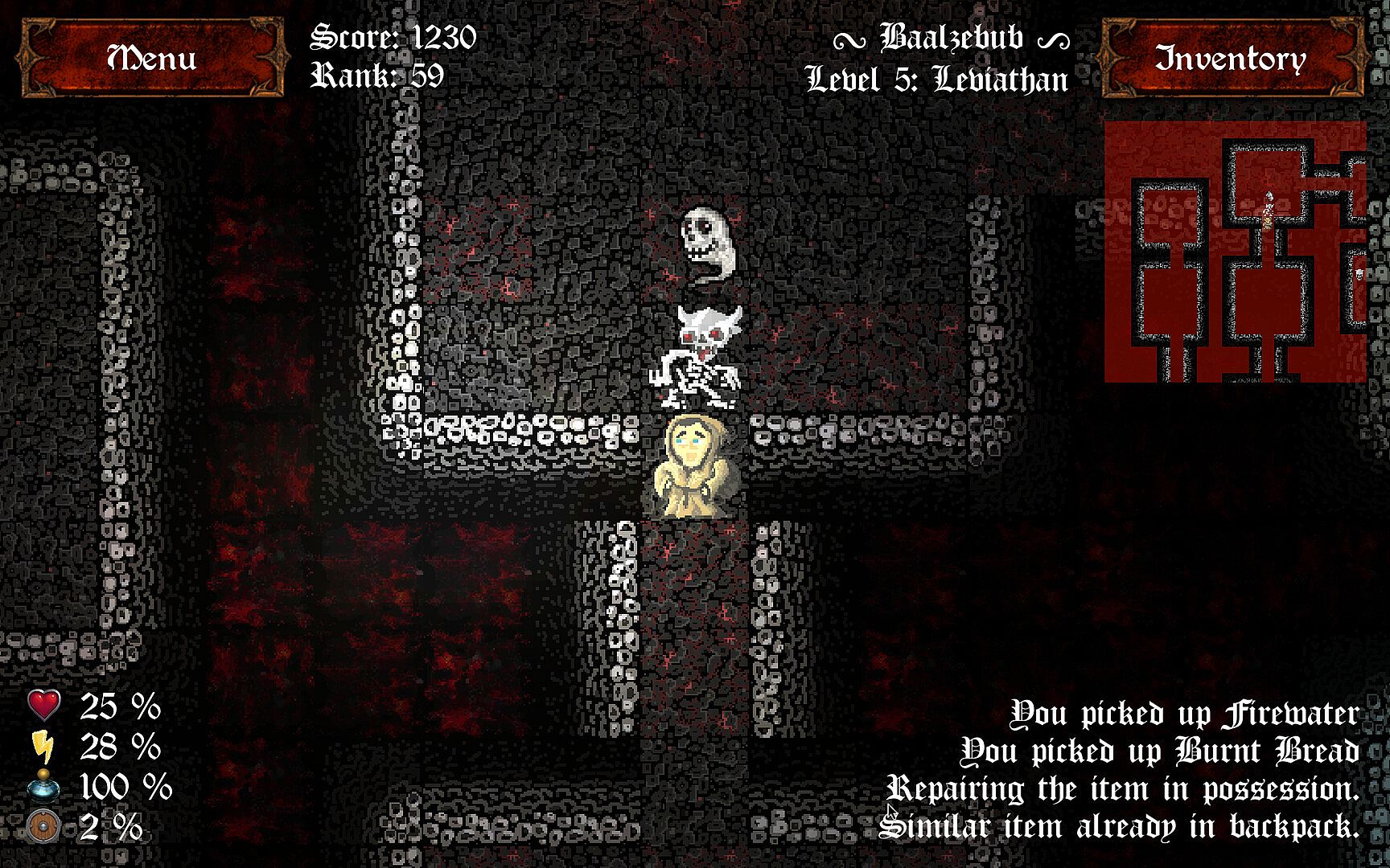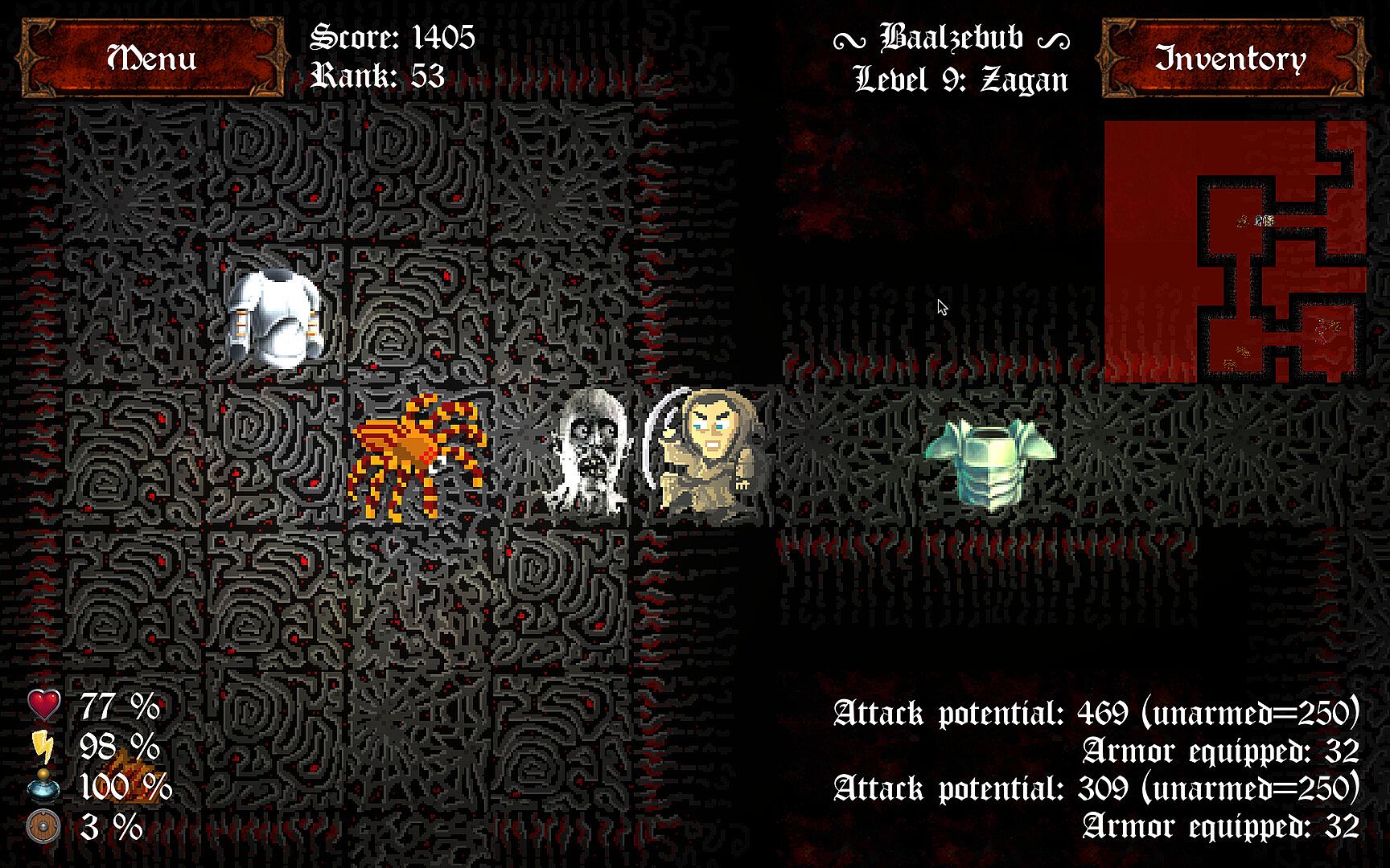 Use arrow keys, WASD keys or a game controller to move your hero and attack nearby enemy creatures. Click locations to set spell cast target or to shoot arrows (with a bow equipped and some arrows in your backpack). You can equip armor items to your hero's body. The equipped items wear when used. The backpack weight does matter. It affects the stamina and health params significantly. Make sure you watch the health and stamina all the time, because with zero health your hero will die forever. When entering a new level (also the first level), some items are hidden by default. This is especially true for the level map and the exit portal. You need to find the red scroll to uncover the hidden properties of the level. Such a scroll is unique and it is in possession of a random opponent.