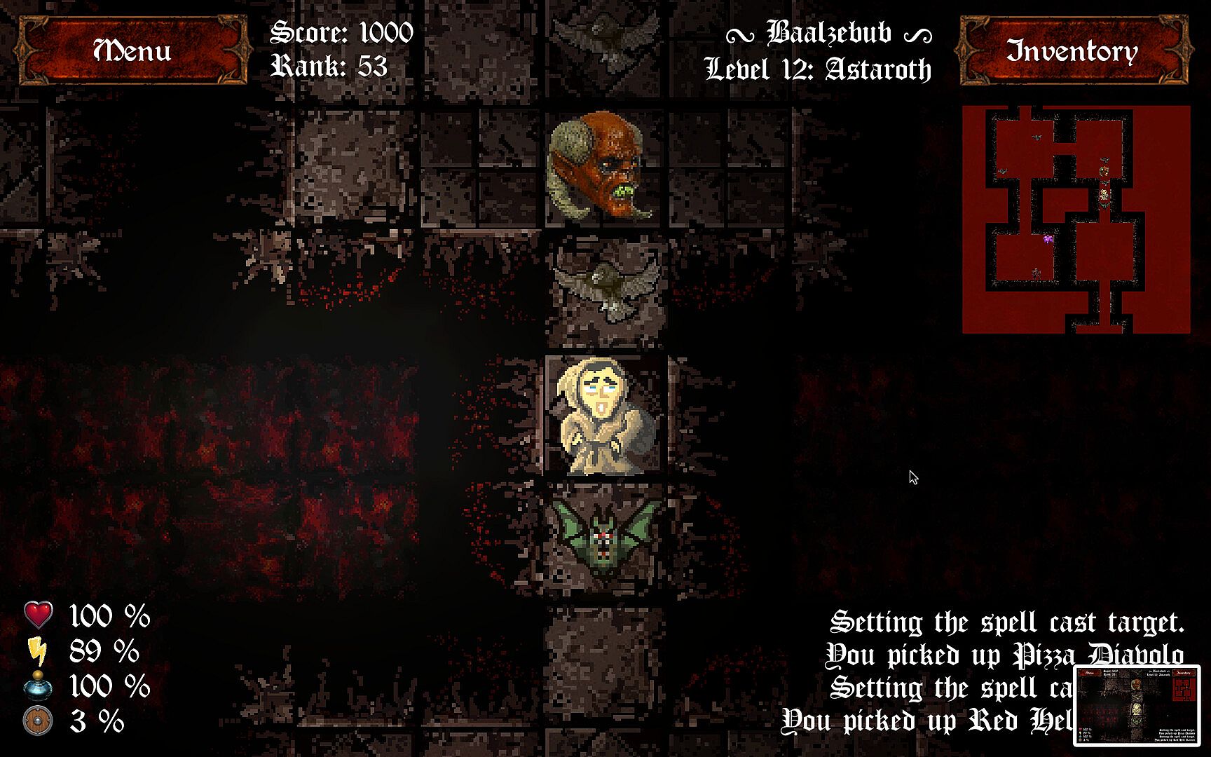 Make your way out through all of the levels of randomly generated infernal dungeon, get the keys, food, weapons and other items from dead monsters, overcome bosses and escape that horror! Try to beat the high score in the global Hall of Fame.