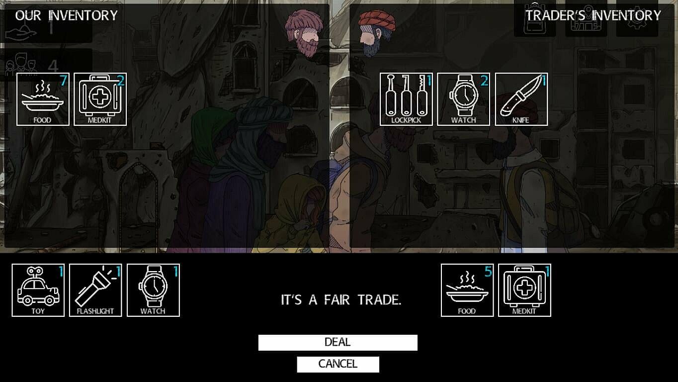 Changing Economy: Items can be traded one-by-one with other refugees or freely negotiated with travelling merchants.