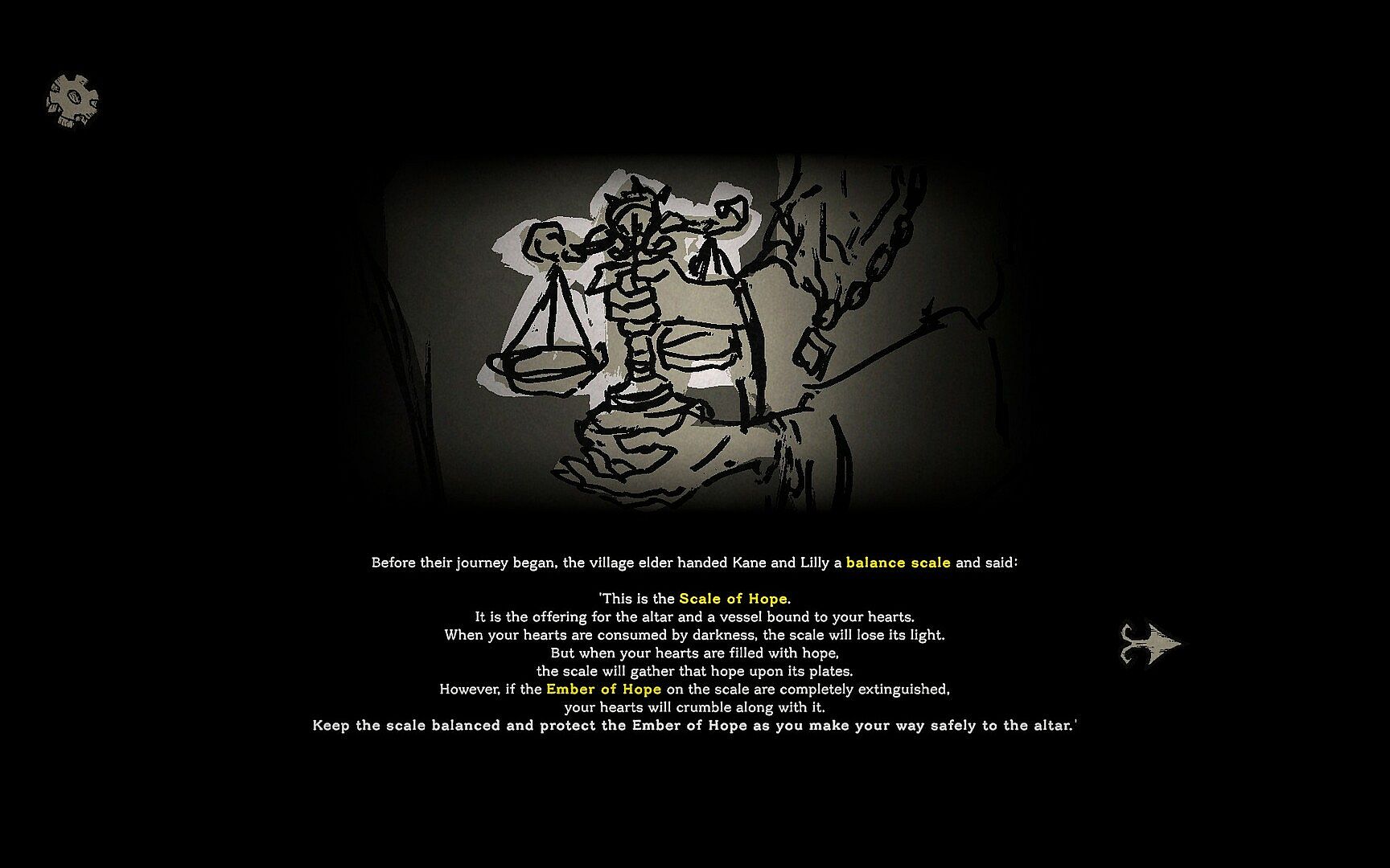 Assigning cards to the twins adds hope to each side of the scale. If the difference in their hope grows too large, the scale will tip, and its balance will begin to falter. When the scale tips completely and balance cannot be restored, its health decreases. Additionally, failing to accumulate enough hope to surpass the set despair value for each trial also reduces the scale’s health. If the scale’s health is fully depleted, the journey can no longer continue.