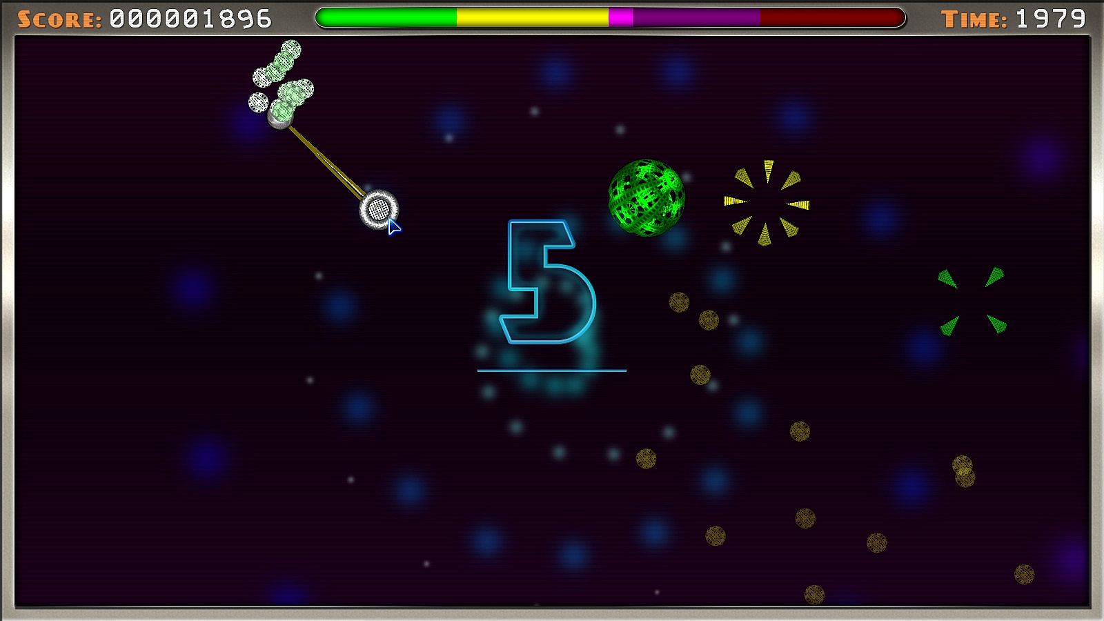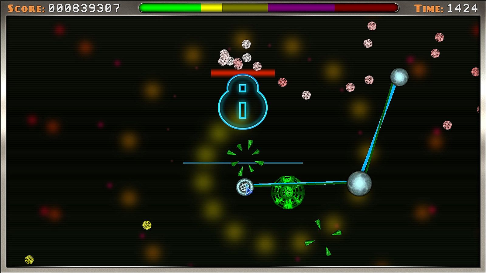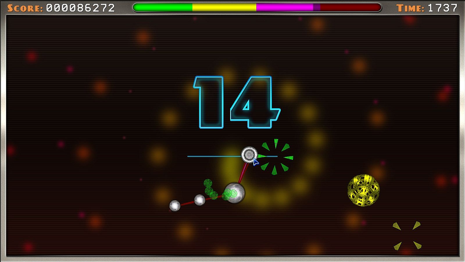 The game's complex scoring formula relies heavily on the length of the string upon impact and speed at which you reach each destructible; your score will increase greatly as you become more skilled. Rack up killer combos by collecting multiple items quickly and with high elasticity.