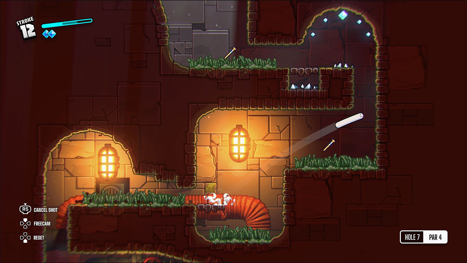 At its core, Ballgame is simple: get from the tee to the hole in as few shots as possible. Simplicity becomes complex in handcrafted courses with platforming challenges, balancing precise shots, and controlled mayhem. Improve every swing and navigate obstacles and objects: spike off bumpers, grind on rails, float in a bubble, die on spikes, and control the chaos. Every shot is a kinetic reaction.Â
