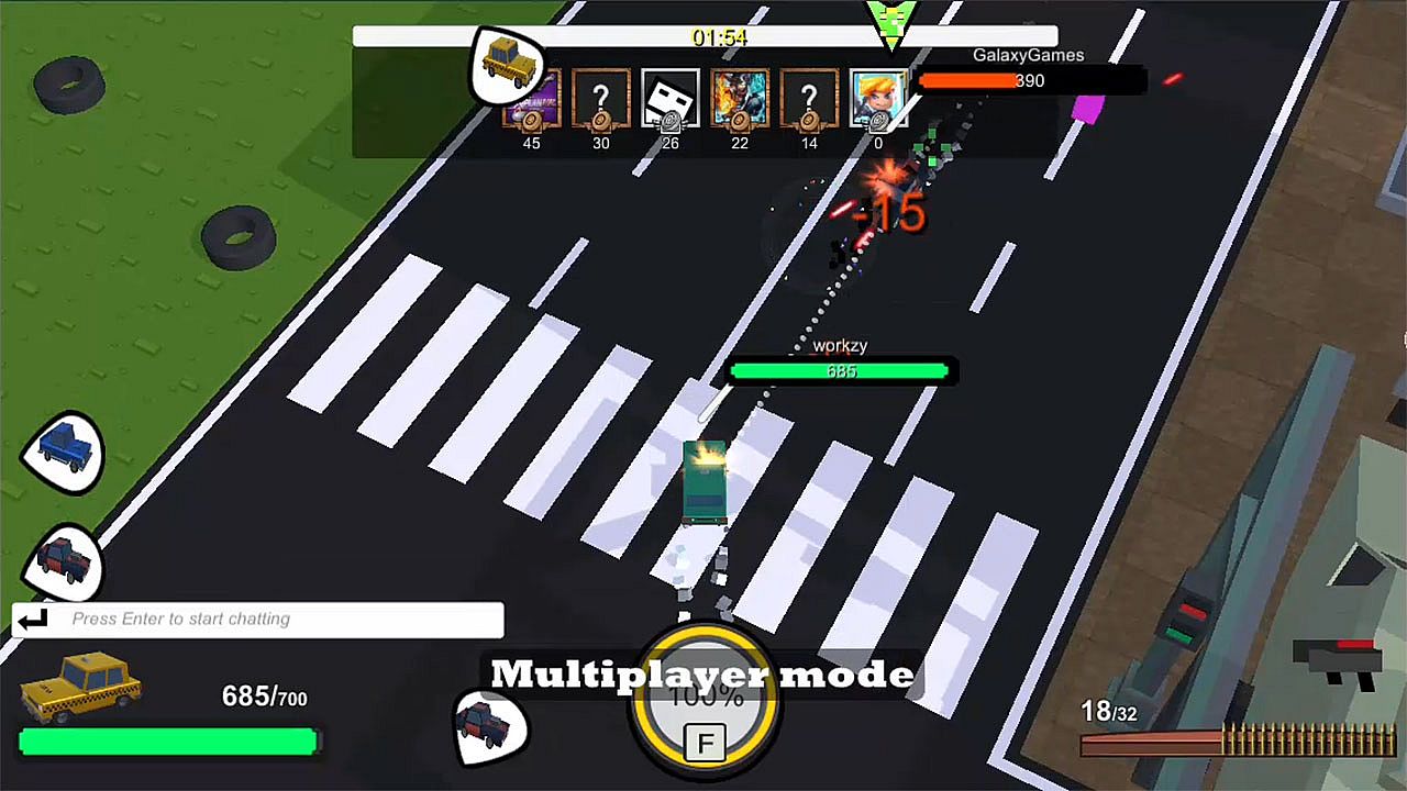 In a post-2020 world choked by polluted air, players pilot oxygen-equipped vehicles to scavenge resources and dominate roads in lawless battles. Control diverse vehicles with unique special abilities like Blue Lightning's speed burst, Shock Wave's melting attack, or Ghost's invisibility, while equipping weapons such as machine guns for steady fire or lasers for piercing damage. Use WASD keys to drive and turn, mouse to shoot, and special keys to unleash abilities in frantic multiplayer clashes. Kill Zone mode pits players in 3-minute deathmatches where randomized weapons decide the top killer. The cartoon Lego style delivers fresh, bright visuals with cute vehicle crashes that evoke carefree childhood play. Casual racing fans crave this indie Early Access title's block-control skirmishes on PC.