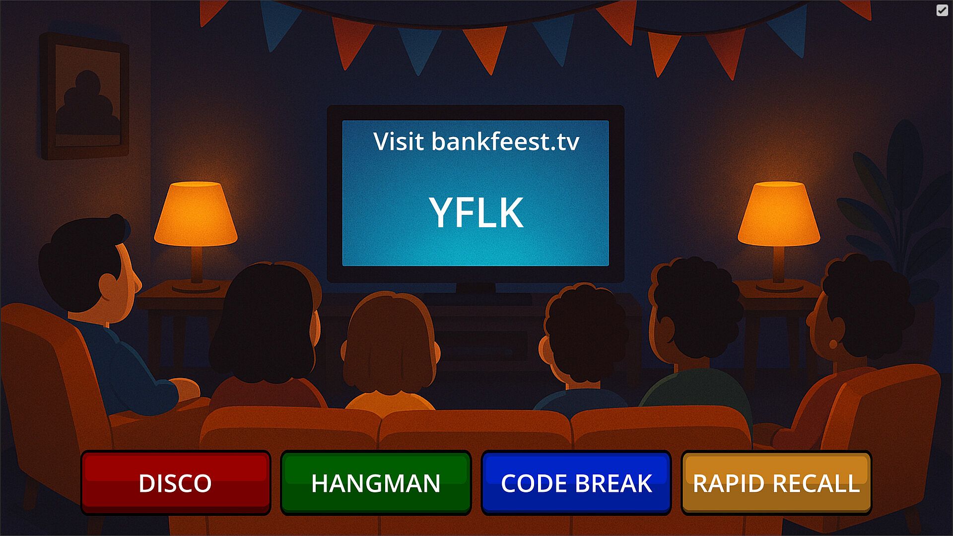Bankfeest is the literal Dutch translation of couch party. This game is meant to be played with friends, either physically on the couch or by screen sharing the game with your friends.
