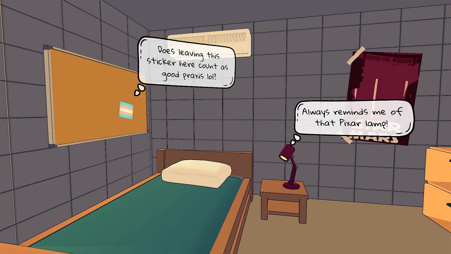Thought bubbles provide insight into Ruby's (sometimes scattered) mind, as you make your way through the mysterious MacLeod library. Use an interactive journal to focus these thoughts and reveal new insights. The more you learn about Ruby's past, and the queer history of MacLeod itself, the more of the library's secrets you'll unlock!