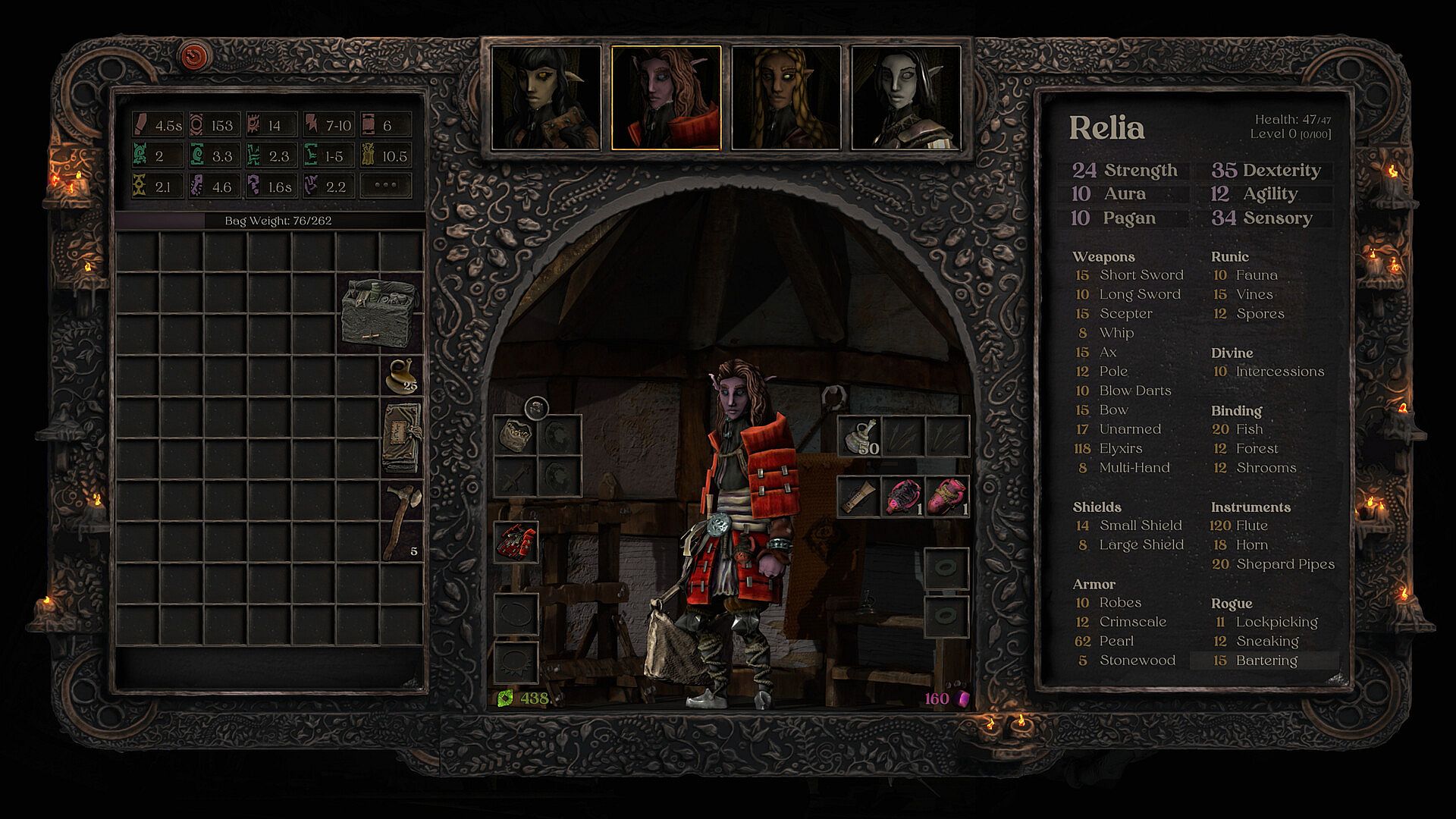 Equip your four companions you've created with a variety of skills to overcome the challenges your adventure will take you through. Choose favored weapons, armor, pagan spells, animal binding, music and rogue abilities and level them up with experience or with buying training from individuals you meet around the island. Skills used most are granted bonuses to get more powerful with level ups.