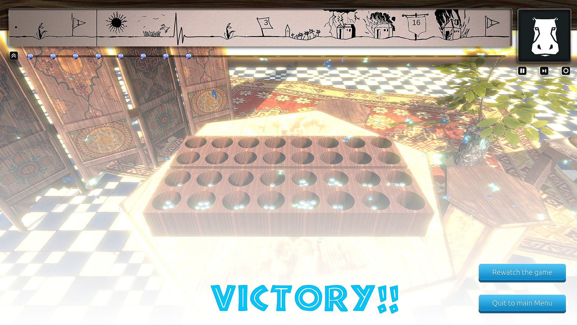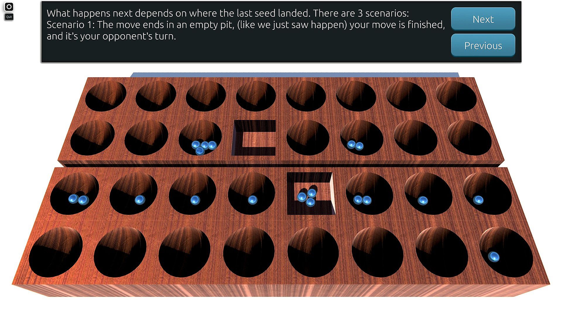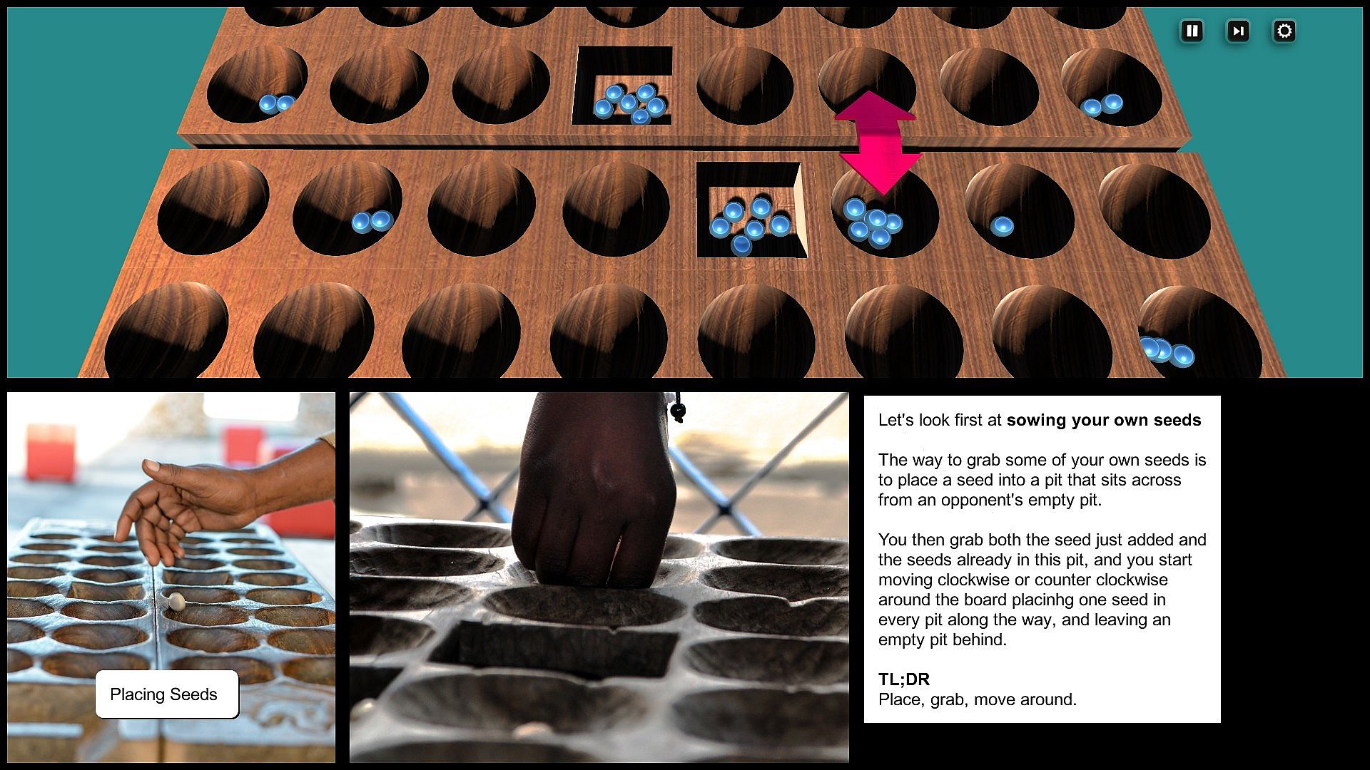 Basics of the game: your goal is to rid your opponent’s front row of seeds, or to put your opponent in a position where they are unable to make any moves (stalemate). You do so by placing, sowing, and stealing seeds.