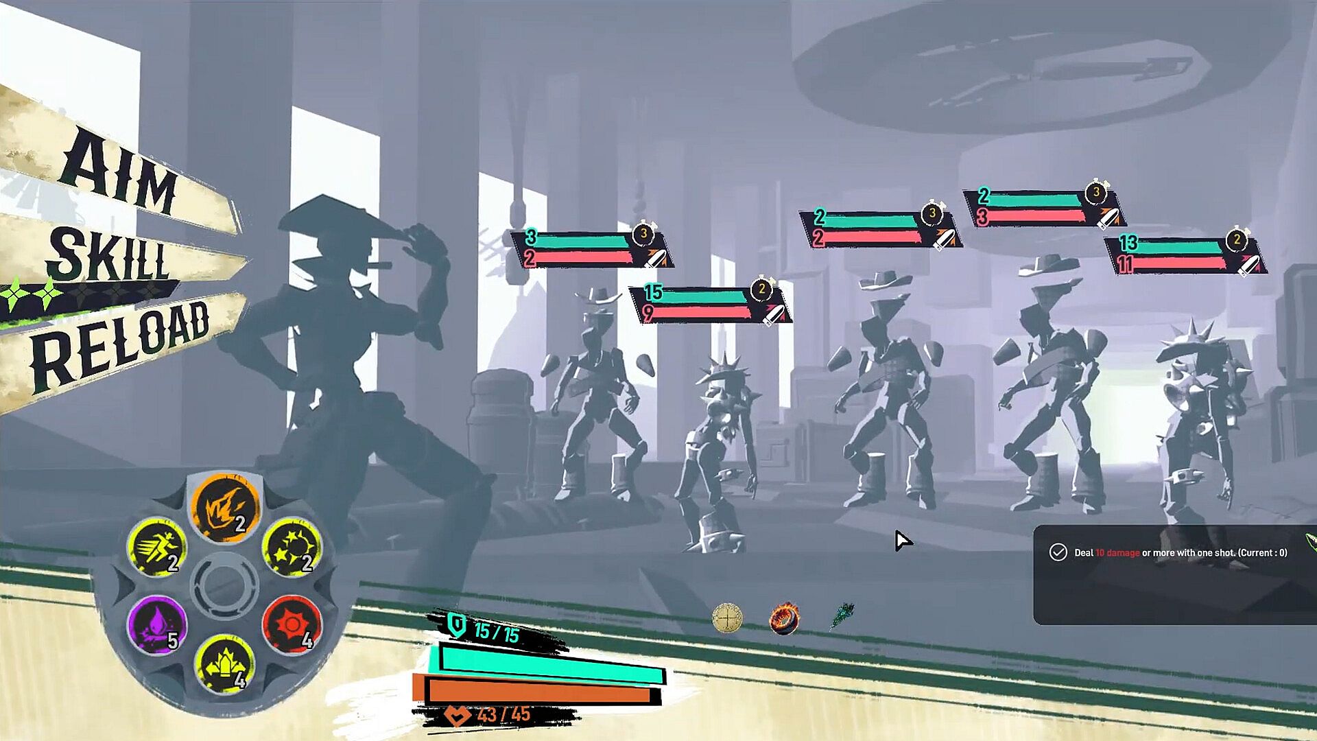Face groups of 3 to 5 bandits in turn based combats. After each of your shots, choose your next bullet between the 3 next and come up with mind blowing combos ! (Literally...)