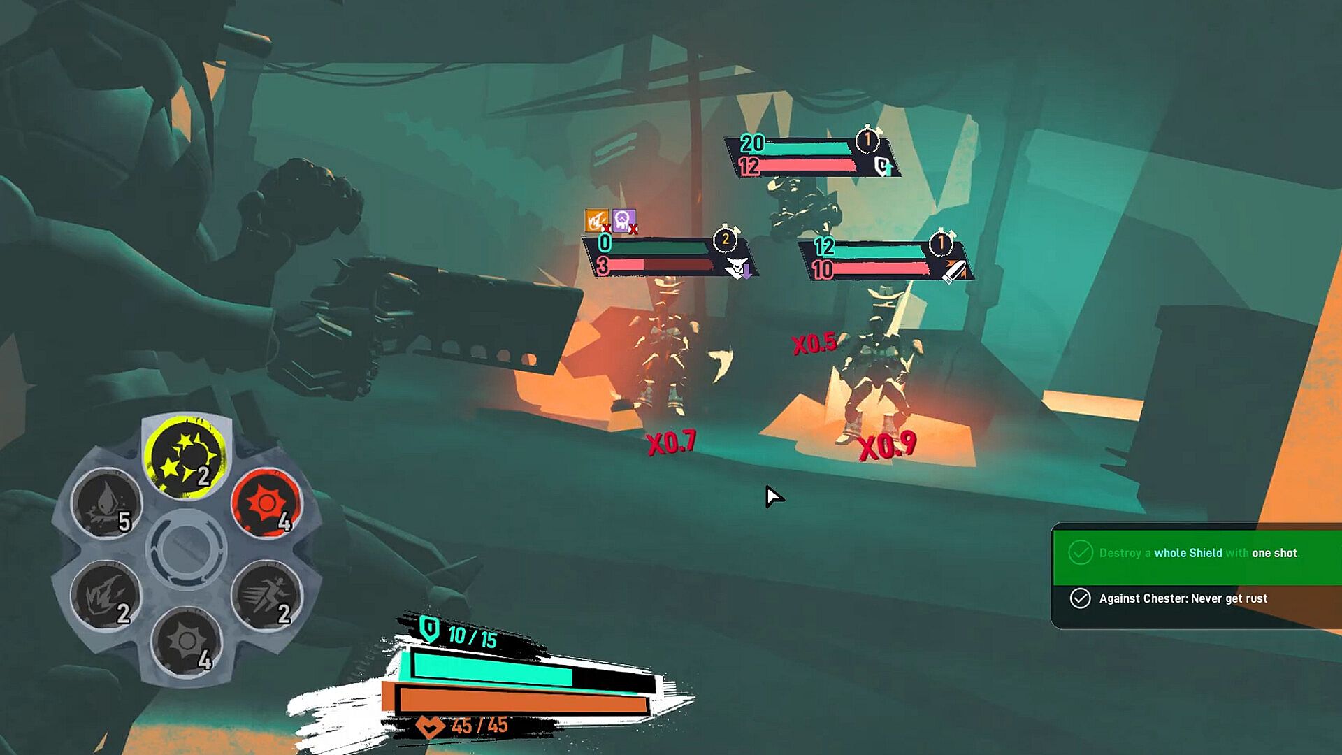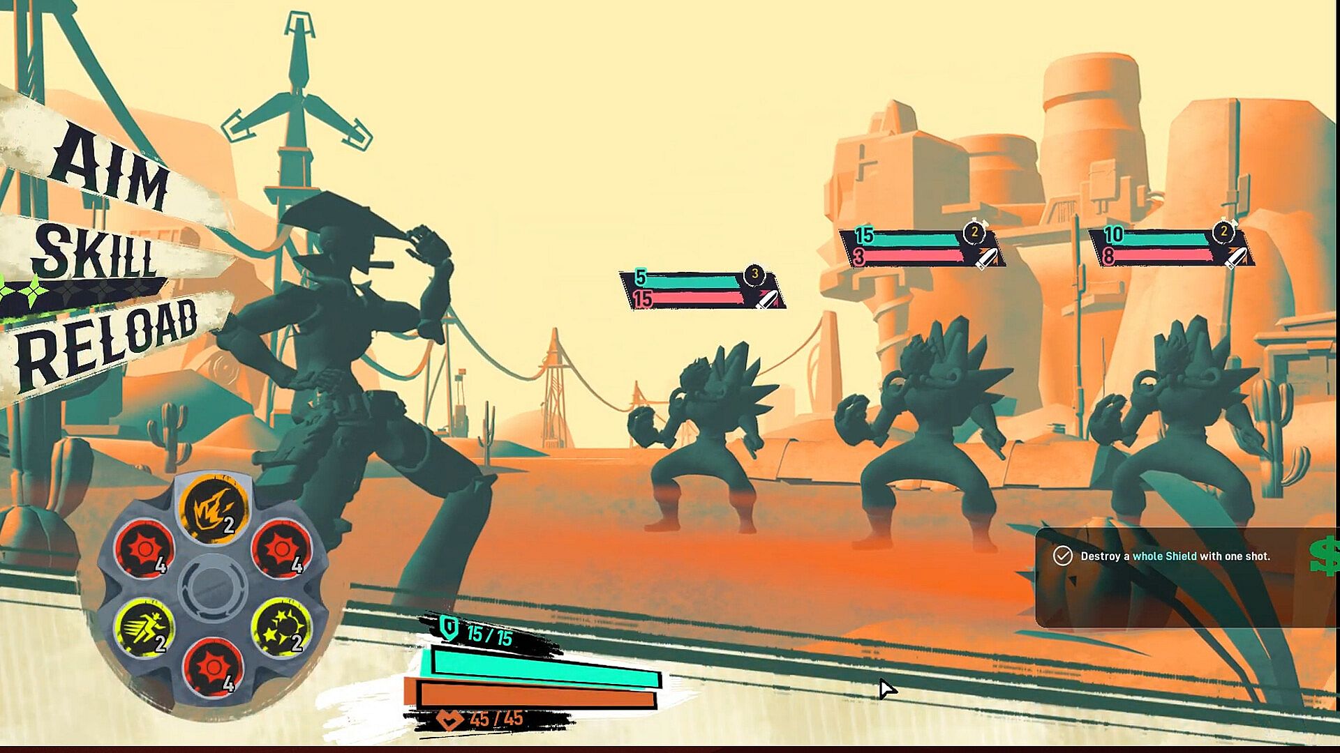 Take down hordes of outlaws to get to their leaders. Collect bullets with special effects, trinkets and resources. Each of your bullets has its archetype (Damage, Shield, Initiative, Focus and Killer). It's up to you to customize your ideal barrel et create powerful synergies to counter your enemies !Â