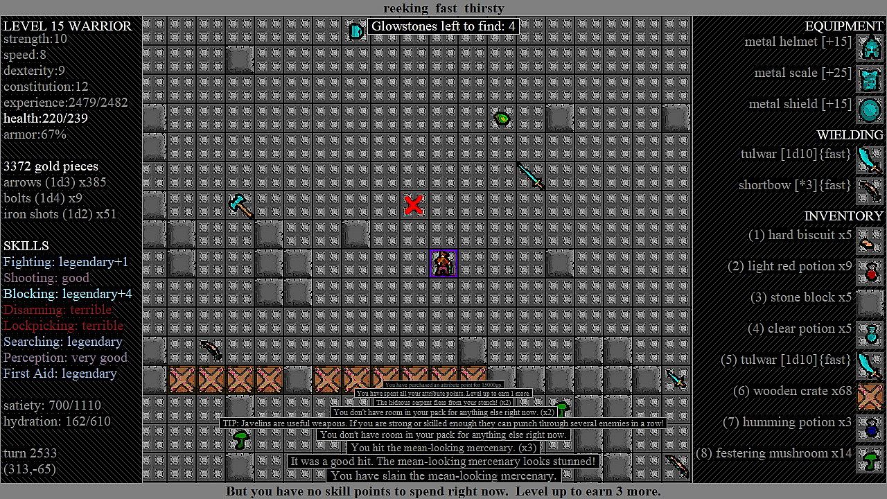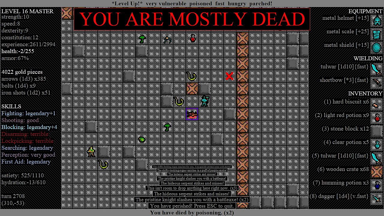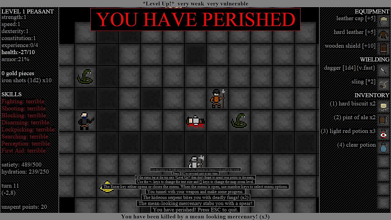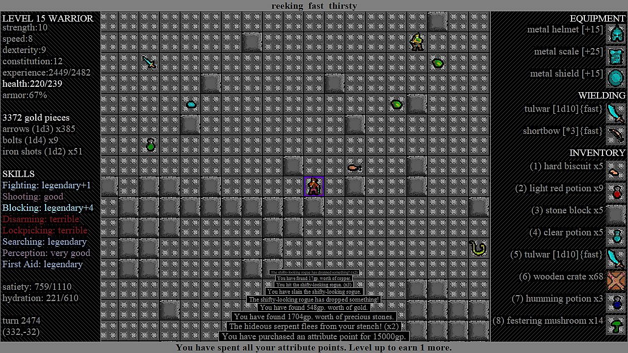 Anyways, more about the game of BASIC ROGUE itself. There are melee weapons. There are shooting and throwing weapons. There's an inventory system. There are ways you can geoengineer the map to build your own house, town, fort, whatever. There are stats. There are skills. There's an equipment upgrade/barter system. There are enemies that hunt you, shoot you, steal your stuff, and kick through doors. There's a poison mechanic. There are status effects. You have to eat and drink to survive. That won't be easy.