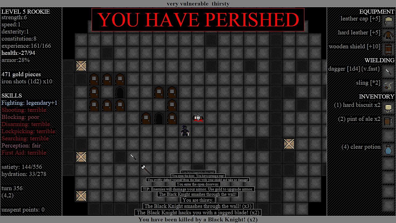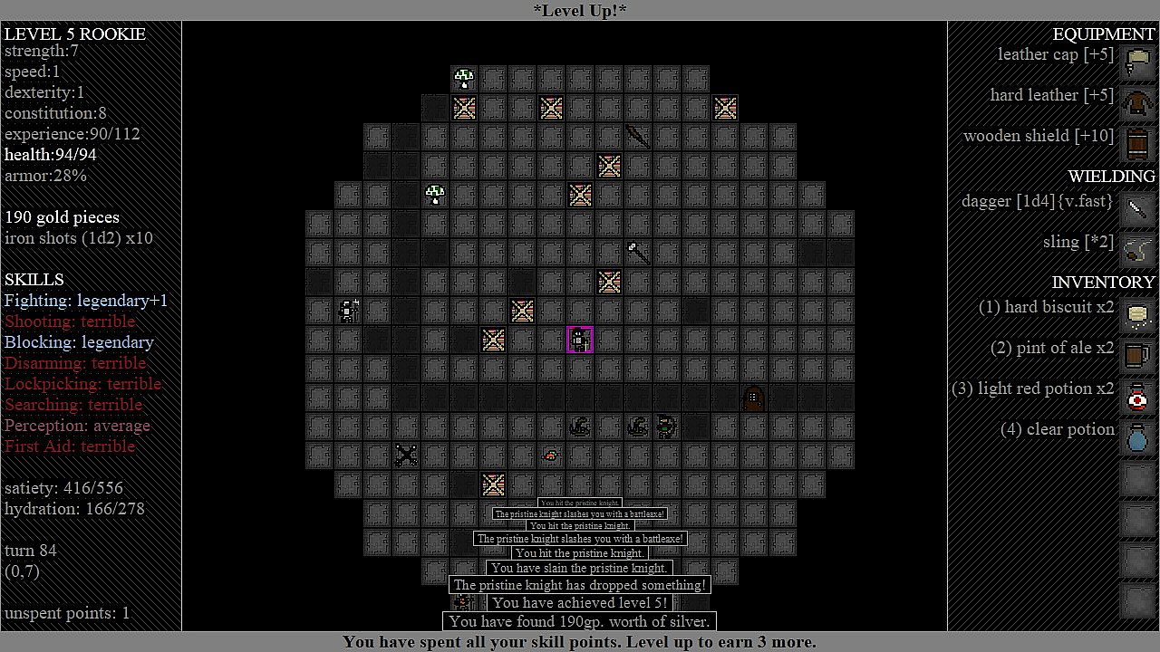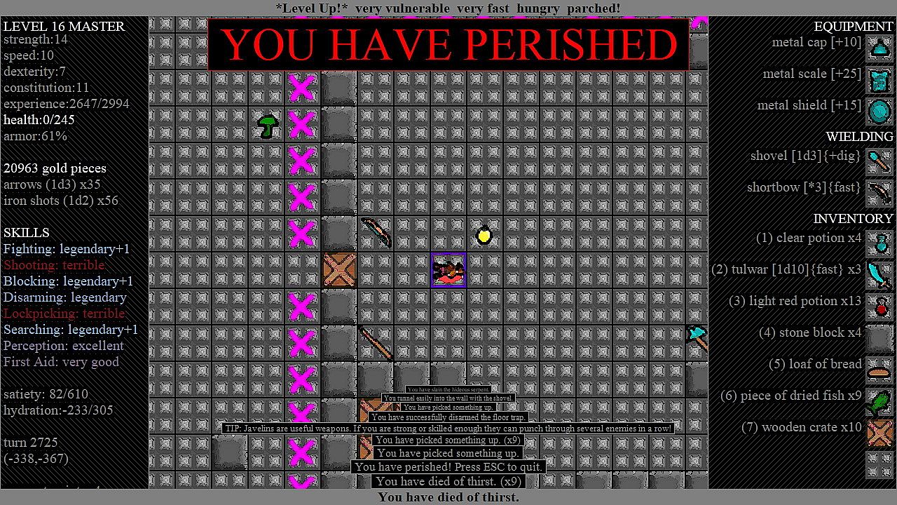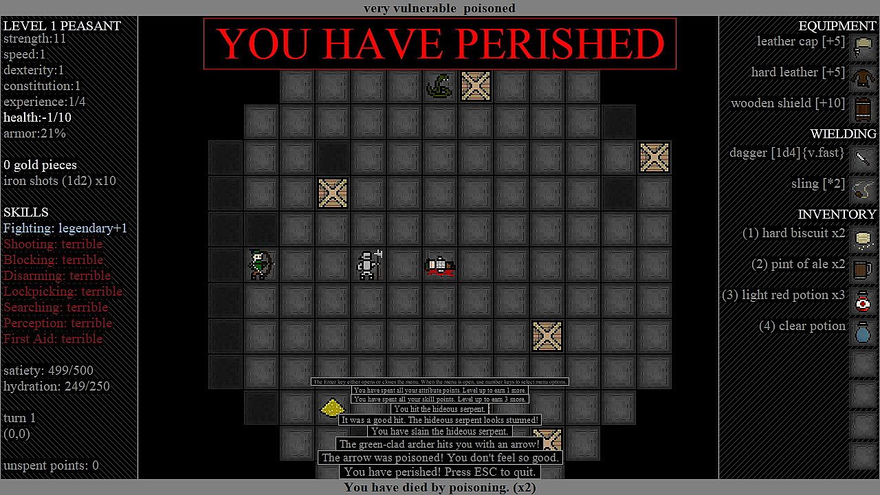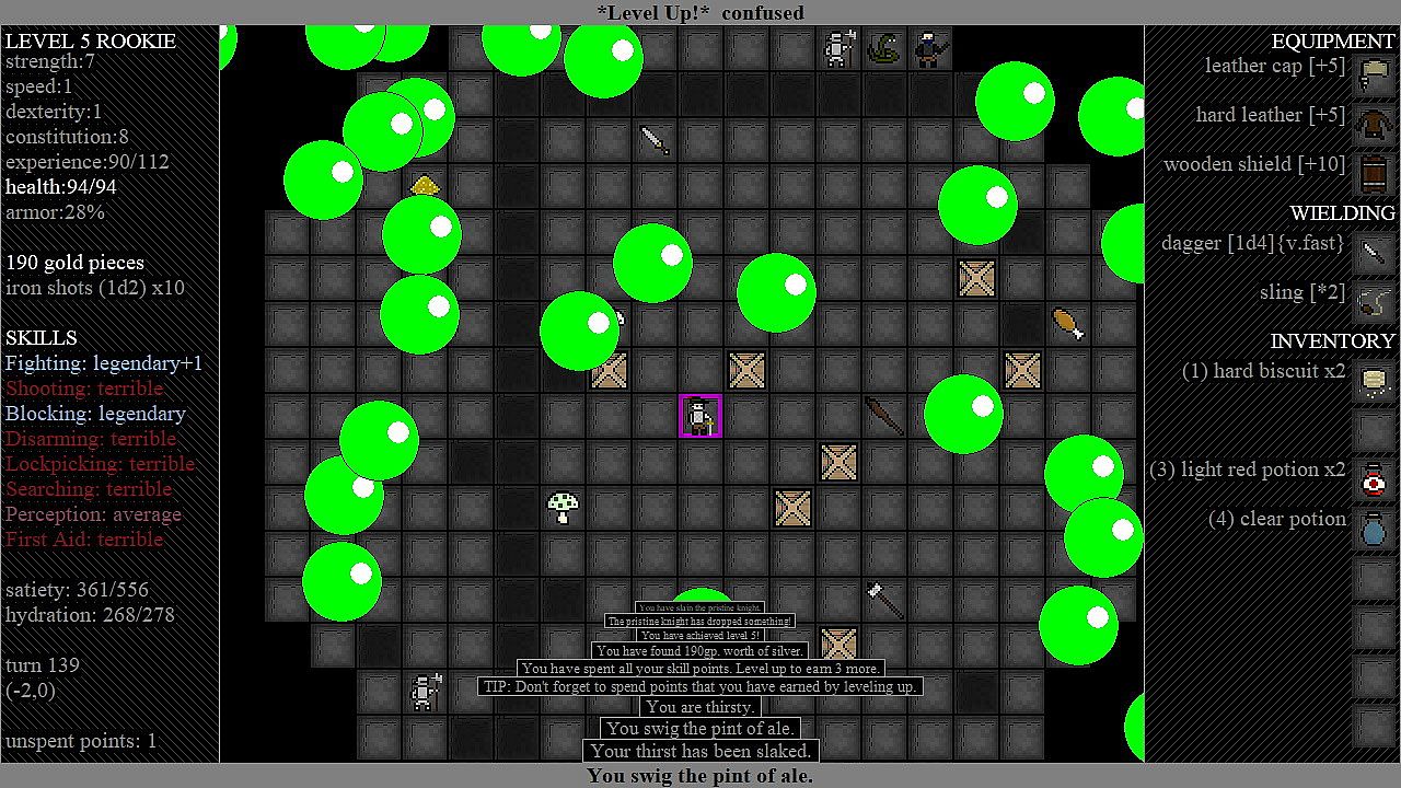 Anyways, more about the game of BASIC ROGUE itself. There are melee weapons. There are shooting and throwing weapons. There's an inventory system. There are ways you can geoengineer the map to build your own house, town, fort, whatever. There are stats. There are skills. There's an equipment upgrade/barter system. There are enemies that hunt you, shoot you, steal your stuff, and kick through doors. There's a poison mechanic. There are status effects. You have to eat and drink to survive. That won't be easy.