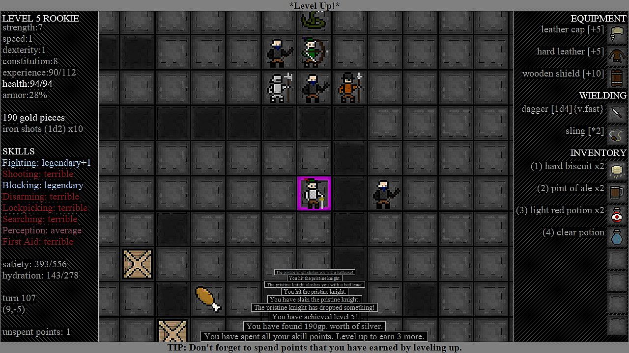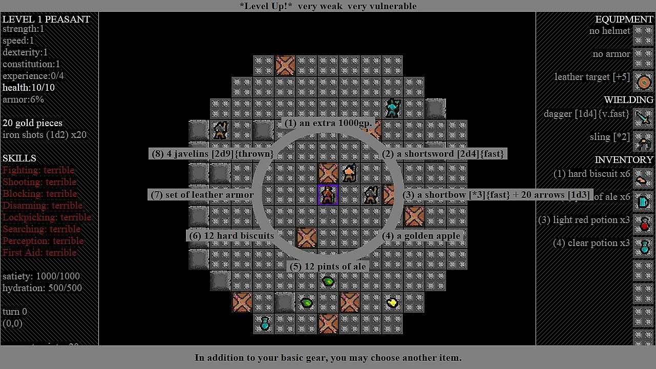BASIC ROGUE delivers a punishing indie RPG challenge with permadeath iron man saves that wipe your progress on every death. Players wield melee weapons, shooting and throwing arms, and manage inventory while eating and drinking to fend off hunger, thirst, and escalating damage. Enemies hunt, shoot, steal gear, smash walls, and poison you amid randomized item and enemy placement on a massive map where you upgrade equipment, barter, assign skill and attribute points, and geoengineer structures like forts. Quality-of-life updates add WASD movement, zoom controls, post-victory play, and turn-counted win screens for scorecards. Hardcore oldschool gamers thrive on the steep learning curve, endless wandering to uncover objectives, and competition for efficient runs.