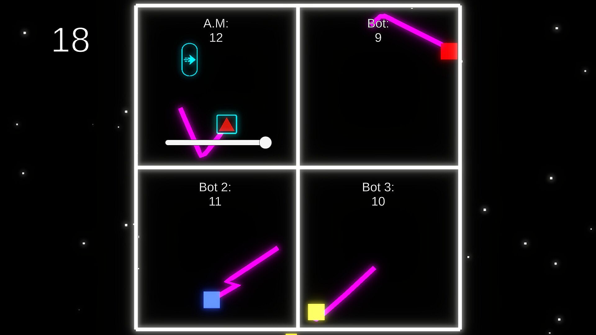 Battle of the Edges is a fast-paced neon arcade game where you bounce through a physics-based arena and compete against three bots to claim as many edges as possible. Your character moves like a bouncy ball, rebounding off walls automatically while you steer using short directional impulses. Hit the right edges, build your score, and outplay the bots.